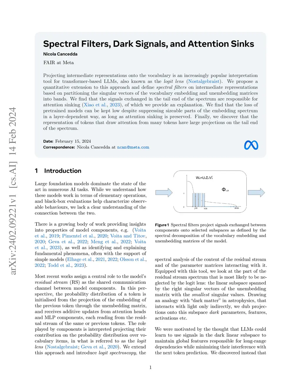 Projecting intermediate representations onto the vocabulary is an increasingly popular interpretation tool for transformer-based LLMs, also known as the logit lens. We propose a quantitative extension to this approach and define spectral filters on intermediate representations based on partitioning the singular vectors of the vocabulary embedding and unembedding matrices into bands. We find that the signals exchanged in the tail end of the spectrum are responsible for attention sinking (Xiao et al. 2023), of which we provide an explanation. We find that the loss of pretrained models can be kept low despite suppressing sizable parts of the embedding spectrum in a layer-dependent way, as long as attention sinking is preserved. Finally, we discover that the representation of tokens that draw attention from many tokens have large projections on the tail end of the spectrum.