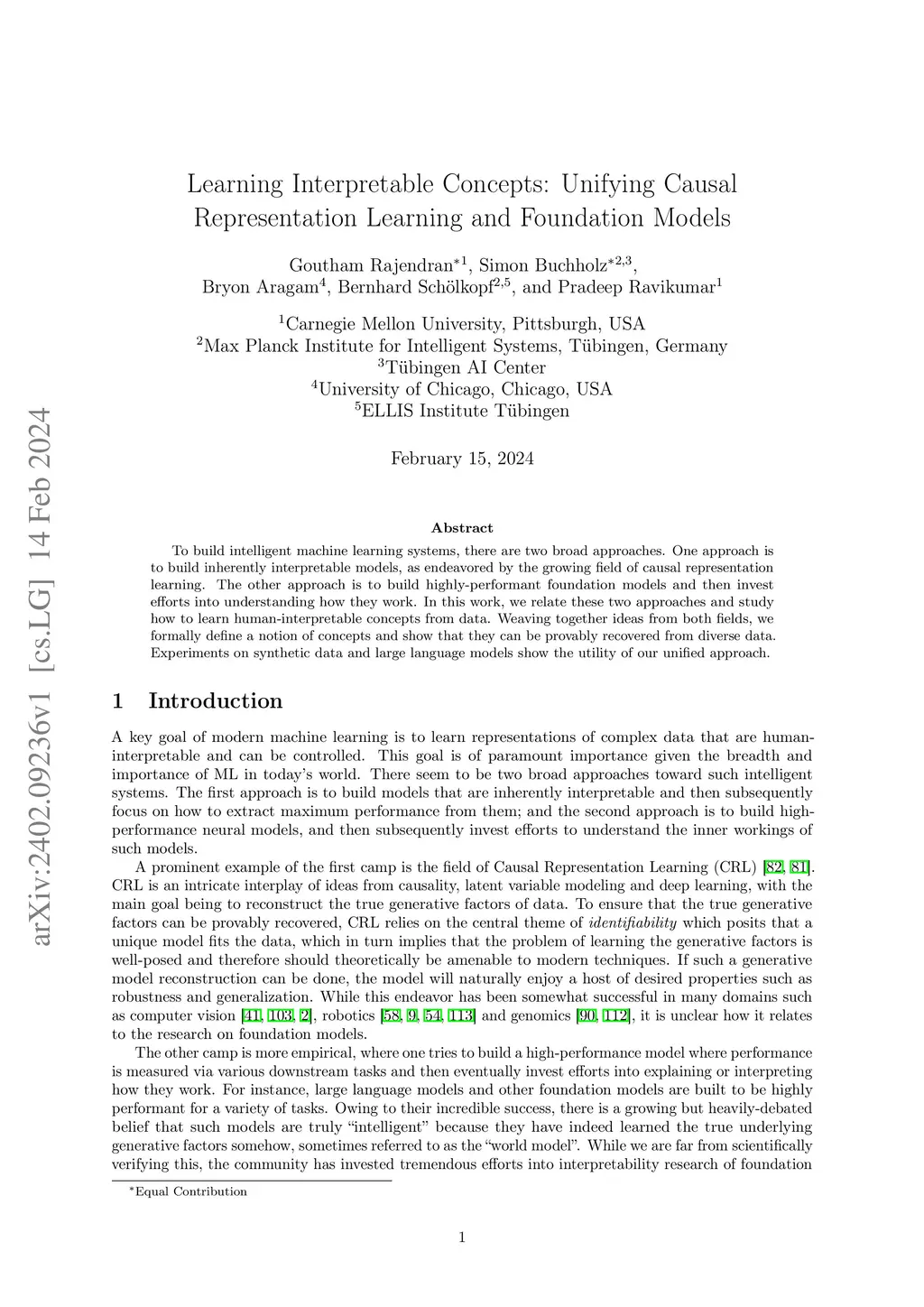 To build intelligent machine learning systems, there are two broad approaches. One approach is to build inherently interpretable models, as endeavored by the growing field of causal representation learning. The other approach is to build highly-performant foundation models and then invest efforts into understanding how they work. In this work, we relate these two approaches and study how to learn human-interpretable concepts from data. Weaving together ideas from both fields, we formally define a notion of concepts and show that they can be provably recovered from diverse data. Experiments on synthetic data and large language models show the utility of our unified approach.