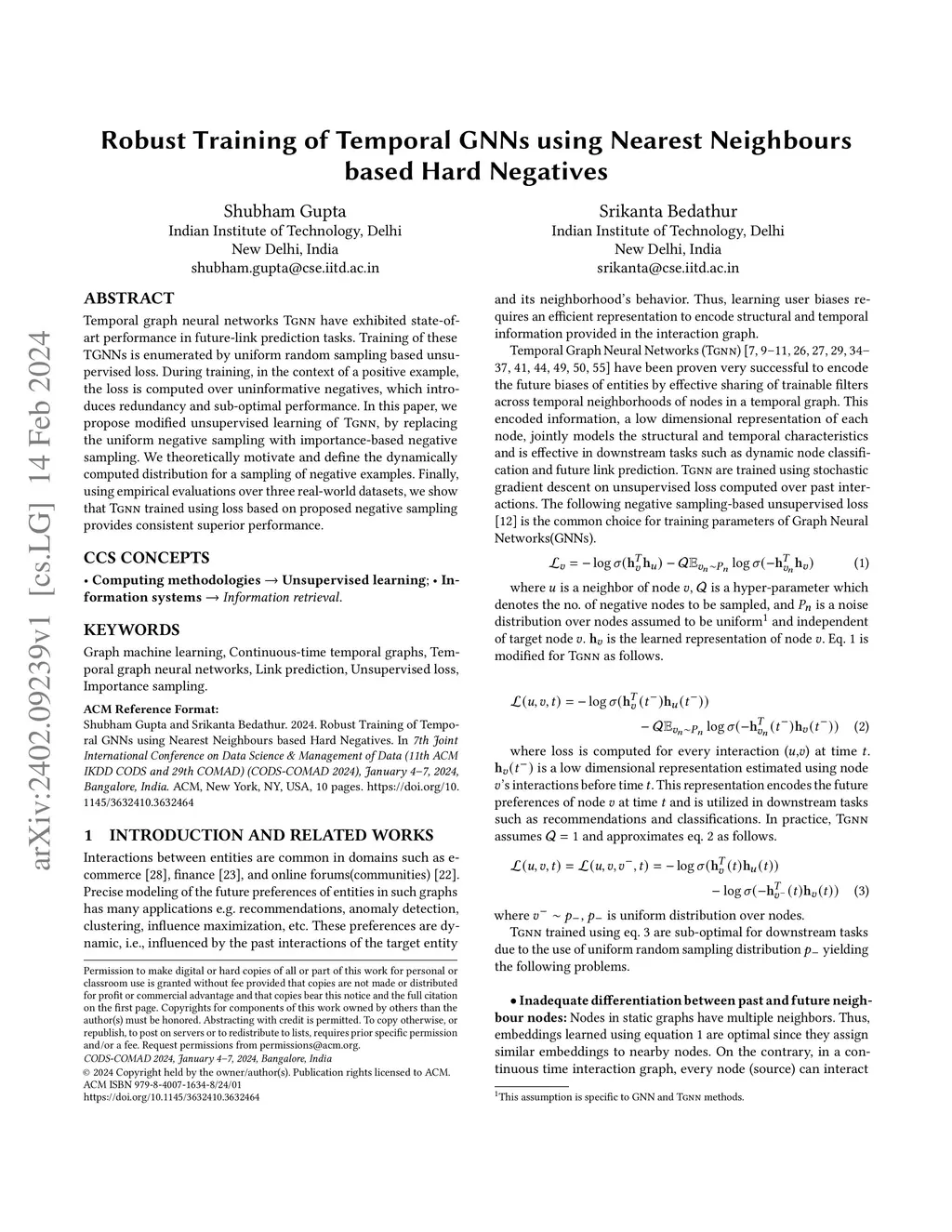 Temporal graph neural networks Tgnn have exhibited state-of-art performance in future-link prediction tasks. Training of these TGNNs is enumerated by uniform random sampling based unsupervised loss. During training, in the context of a positive example, the loss is computed over uninformative negatives, which introduces redundancy and sub-optimal performance. In this paper, we propose modified unsupervised learning of Tgnn, by replacing the uniform negative sampling with importance-based negative sampling. We theoretically motivate and define the dynamically computed distribution for a sampling of negative examples. Finally, using empirical evaluations over three real-world datasets, we show that Tgnn trained using loss based on proposed negative sampling provides consistent superior performance.
