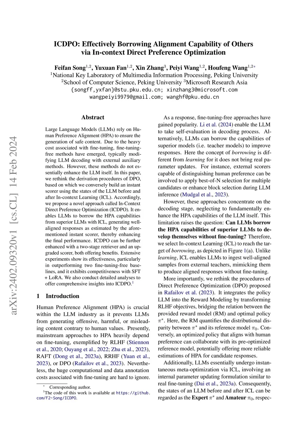 Large Language Models (LLMs) rely on Human Preference Alignment (HPA) to ensure the generation of safe content. Due to the heavy cost associated with fine-tuning, fine-tuning-free methods have emerged, typically modifying LLM decoding with external auxiliary methods. However, these methods do not essentially enhance the LLM itself. In this paper, we rethink the derivation procedures of DPO, based on which we conversely build an instant scorer using the states of the LLM before and after In-context Learning (ICL). Accordingly, we propose a novel approach called In-Context Direct Preference Optimization (ICDPO). It enables LLMs to borrow the HPA capabilities from superior LLMs with ICL, generating well-aligned responses as estimated by the aforementioned instant scorer, thereby enhancing the final performance. ICDPO can be further enhanced with a two-stage retriever and an upgraded scorer, both offering benefits. Extensive experiments show its effectiveness, particularly in outperforming two fine-tuning-free baselines, and it exhibits competitiveness with SFT + LoRA. We also conduct detailed analyses to offer comprehensive insights into ICDPO.