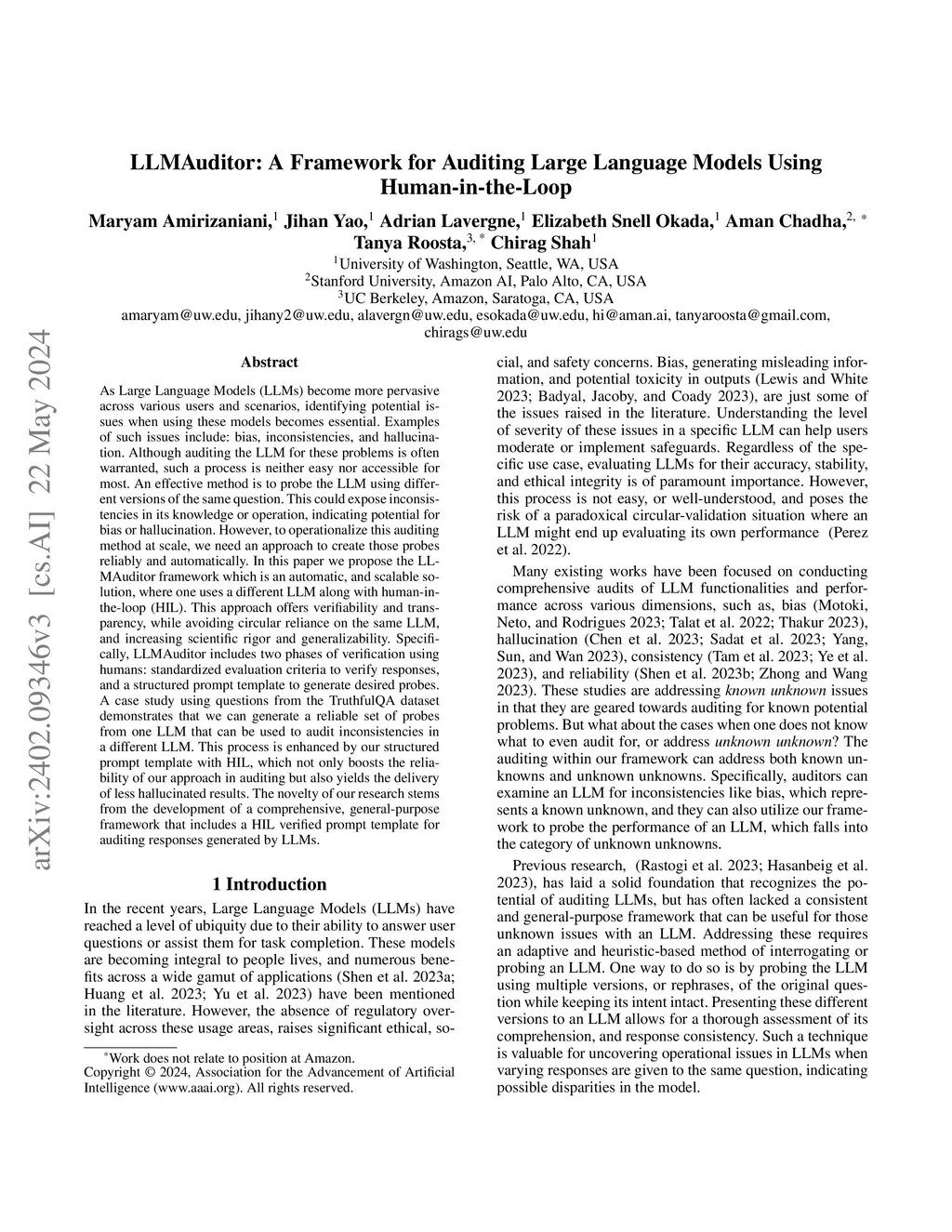 As Large Language Models (LLMs) become more pervasive across various users and scenarios, identifying potential issues when using these models becomes essential. Examples of such issues include: bias, inconsistencies, and hallucination. Although auditing the LLM for these problems is often warranted, such a process is neither easy nor accessible for most. An effective method is to probe the LLM using different versions of the same question. This could expose inconsistencies in its knowledge or operation, indicating potential for bias or hallucination. However, to operationalize this auditing method at scale, we need an approach to create those probes reliably and automatically. In this paper we propose the LLMAuditor framework which is an automatic, and scalable solution, where one uses a different LLM along with human-in-the-loop (HIL). This approach offers verifiability and transparency, while avoiding circular reliance on the same LLM, and increasing scientific rigor and generalizability. Specifically, LLMAuditor includes two phases of verification using humans: standardized evaluation criteria to verify responses, and a structured prompt template to generate desired probes. A case study using questions from the TruthfulQA dataset demonstrates that we can generate a reliable set of probes from one LLM that can be used to audit inconsistencies in a different LLM. This process is enhanced by our structured prompt template with HIL, which not only boosts the reliability of our approach in auditing but also yields the delivery of less hallucinated results. The novelty of our research stems from the development of a comprehensive, general-purpose framework that includes a HIL verified prompt template for auditing responses generated by LLMs.