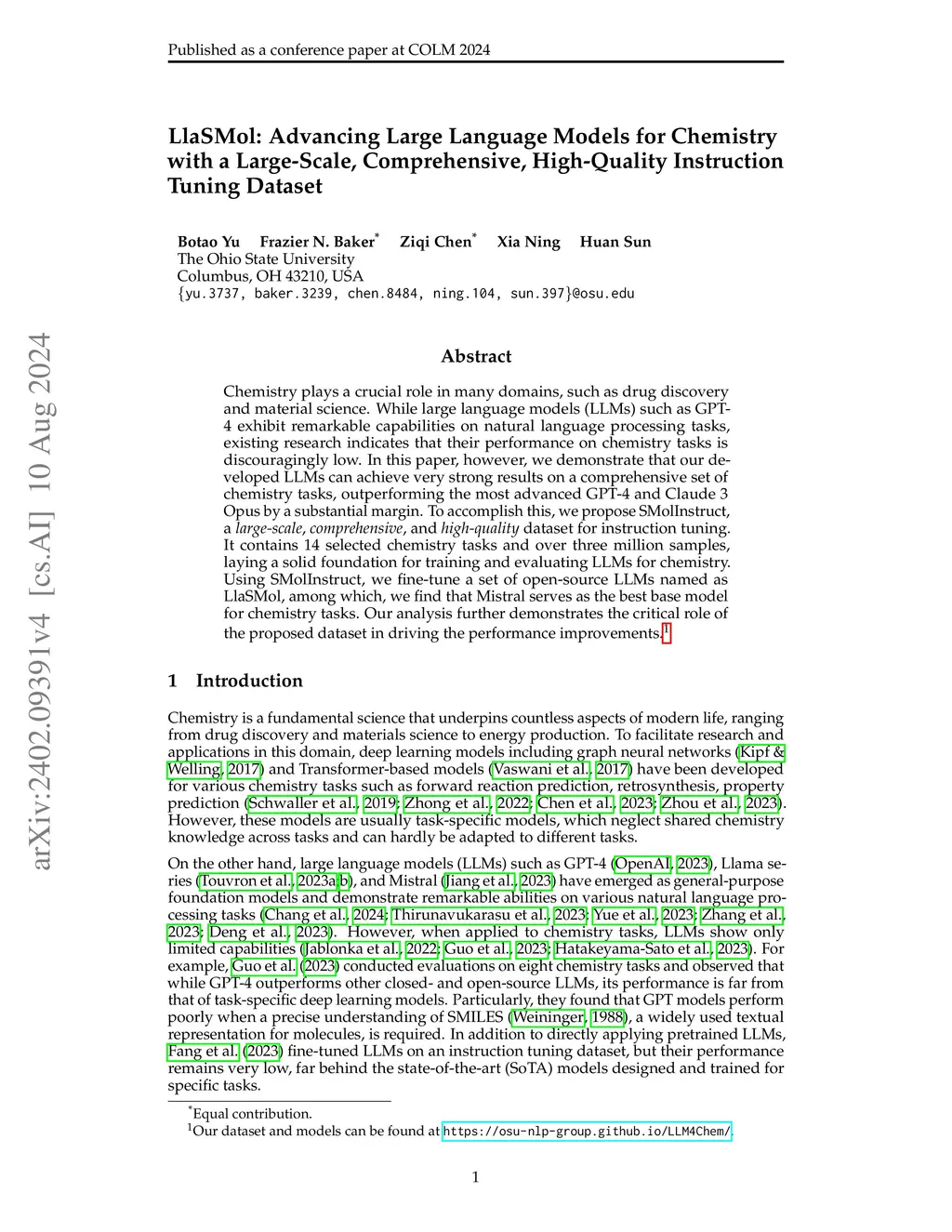 Chemistry plays a crucial role in many domains, such as drug discovery and material science. While large language models (LLMs) such as GPT-4 exhibit remarkable capabilities on natural language processing tasks, existing research indicates that their performance on chemistry tasks is discouragingly low. In this paper, however, we demonstrate that our developed LLMs can achieve very strong results on a comprehensive set of chemistry tasks, outperforming the most advanced GPT-4 and Claude 3 Opus by a substantial margin. To accomplish this, we propose SMolInstruct, a large-scale, comprehensive, and high-quality dataset for instruction tuning. It contains 14 selected chemistry tasks and over three million samples, laying a solid foundation for training and evaluating LLMs for chemistry. Using SMolInstruct, we fine-tune a set of open-source LLMs, among which, we find that Mistral serves as the best base model for chemistry tasks. Our analysis further demonstrates the critical role of the proposed dataset in driving the performance improvements.
