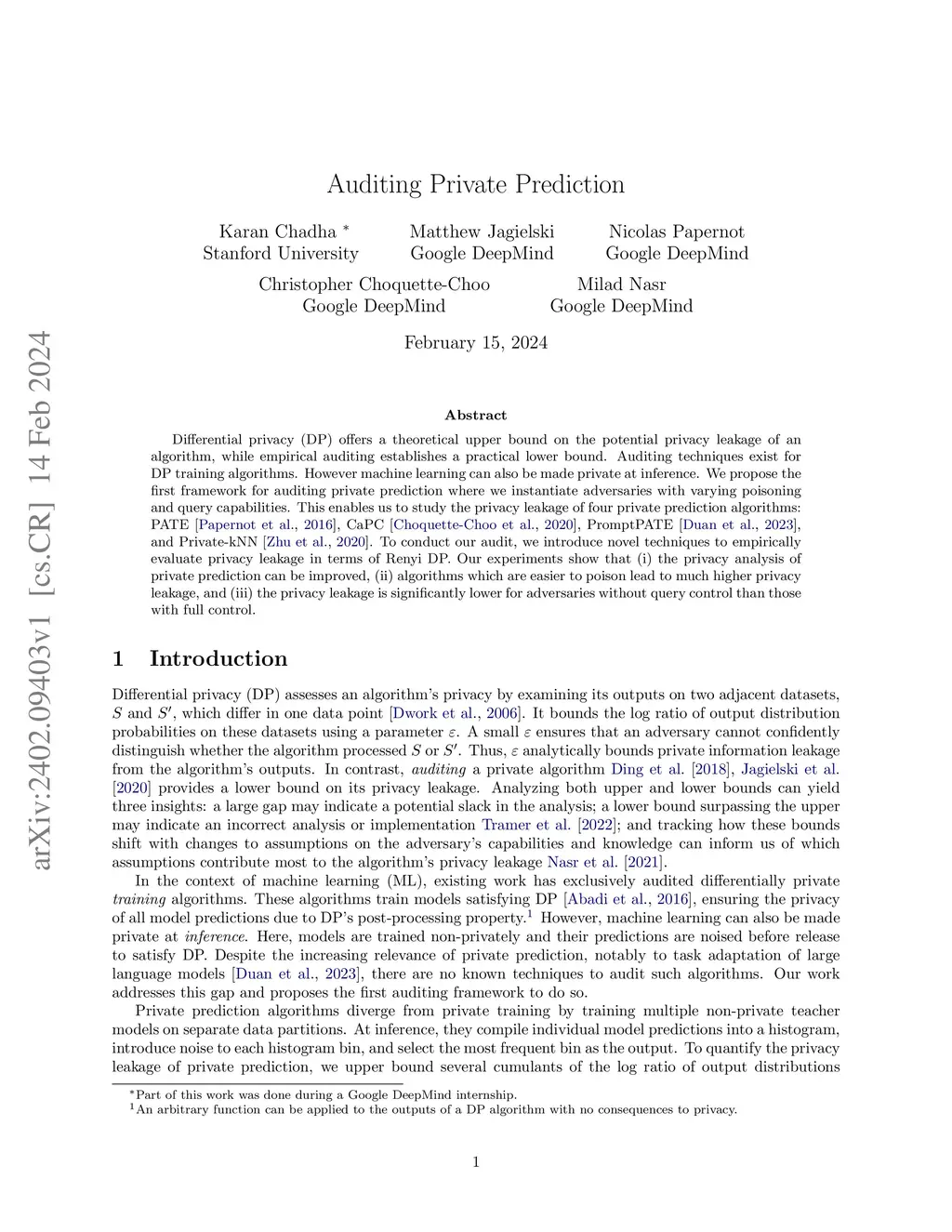 Differential privacy (DP) offers a theoretical upper bound on the potential privacy leakage of analgorithm, while empirical auditing establishes a practical lower bound. Auditing techniques exist forDP training algorithms. However machine learning can also be made private at inference. We propose thefirst framework for auditing private prediction where we instantiate adversaries with varying poisoningand query capabilities. This enables us to study the privacy leakage of four private prediction algorithms:PATE [Papernot et al., 2016], CaPC [Choquette-Choo et al., 2020], PromptPATE [Duan et al., 2023],and Private-kNN [Zhu et al., 2020]. To conduct our audit, we introduce novel techniques to empiricallyevaluate privacy leakage in terms of Renyi DP. Our experiments show that (i) the privacy analysis ofprivate prediction can be improved, (ii) algorithms which are easier to poison lead to much higher privacyleakage, and (iii) the privacy leakage is significantly lower for adversaries without query control than thosewith full control.