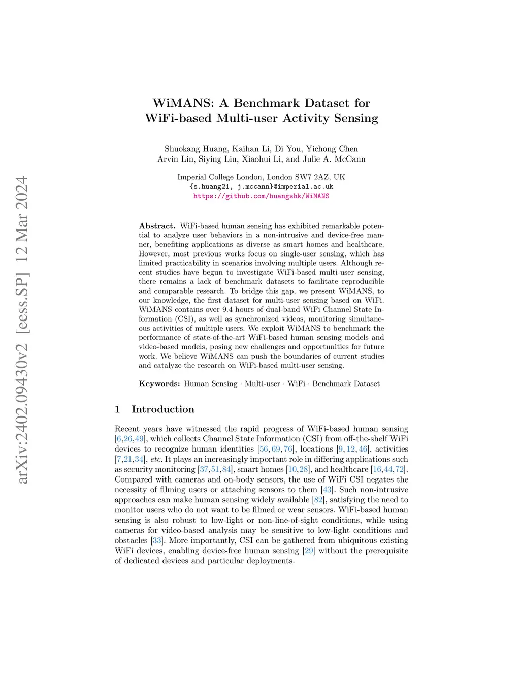 WiFi-based human sensing has exhibited remarkable potential to analyze user behaviors in a non-intrusive and device-free manner, benefiting applications as diverse as smart homes and healthcare. However, most previous works focus on single-user sensing, which has limited practicability in scenarios involving multiple users. Although recent studies have begun to investigate WiFi-based multi-user sensing, there remains a lack of benchmark datasets to facilitate reproducible and comparable research. To bridge this gap, we present WiMANS, to our knowledge, the first dataset for multi-user sensing based on WiFi. WiMANS contains over 9.4 hours of dual-band WiFi Channel State Information (CSI), as well as synchronized videos, monitoring simultaneous activities of multiple users. We exploit WiMANS to benchmark the performance of state-of-the-art WiFi-based human sensing models and video-based models, posing new challenges and opportunities for future work. We believe WiMANS can push the boundaries of current studies and catalyze the research on WiFi-based multi-user sensing.