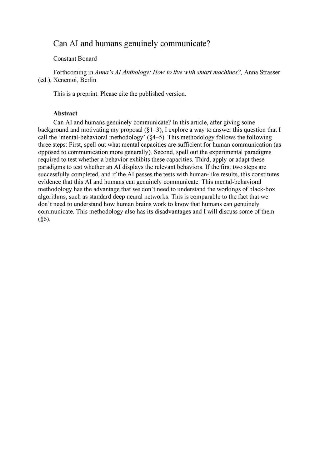 Can AI and humans genuinely communicate? In this article, after giving some background and motivating my proposal (sections 1 to 3), I explore a way to answer this question that I call the "mental-behavioral methodology" (sections 4 and 5). This methodology follows the following three steps: First, spell out what mental capacities are sufficient for human communication (as opposed to communication more generally). Second, spell out the experimental paradigms required to test whether a behavior exhibits these capacities. Third, apply or adapt these paradigms to test whether an AI displays the relevant behaviors. If the first two steps are successfully completed, and if the AI passes the tests with human-like results, this constitutes evidence that this AI and humans can genuinely communicate. This mental-behavioral methodology has the advantage that we don't need to understand the workings of black-box algorithms, such as standard deep neural networks. This is comparable to the fact that we don't need to understand how human brains work to know that humans can genuinely communicate. This methodology also has its disadvantages and I will discuss some of them (section 6).