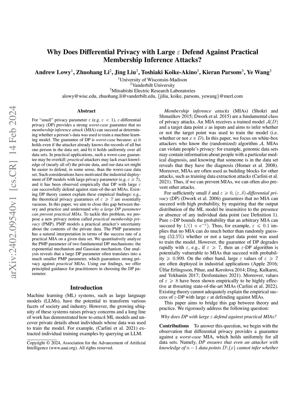 For small privacy parameter , -differential privacy (DP) provides a strong worst-case guarantee that no membership inference attack (MIA) can succeed at determining whether a person's data was used to train a machine learning model. The guarantee of DP is worst-case because: a) it holds even if the attacker already knows the records of all but one person in the data set; and b) it holds uniformly over all data sets. In practical applications, such a worst-case guarantee may be overkill: practical attackers may lack exact knowledge of (nearly all of) the private data, and our data set might be easier to defend, in some sense, than the worst-case data set. Such considerations have motivated the industrial deployment of DP models with large privacy parameter (e.g. ), and it has been observed empirically that DP with large can successfully defend against state-of-the-art MIAs. Existing DP theory cannot explain these empirical findings: e.g., the theoretical privacy guarantees of are essentially vacuous. In this paper, we aim to close this gap between theory and practice and understand why a large DP parameter can prevent practical MIAs. To tackle this problem, we propose a new privacy notion called practical membership privacy (PMP). PMP models a practical attacker's uncertainty about the contents of the private data. The PMP parameter has a natural interpretation in terms of the success rate of a practical MIA on a given data set. We quantitatively analyze the PMP parameter of two fundamental DP mechanisms: the exponential mechanism and Gaussian mechanism. Our analysis reveals that a large DP parameter often translates into a much smaller PMP parameter, which guarantees strong privacy against practical MIAs. Using our findings, we offer principled guidance for practitioners in choosing the DP parameter.