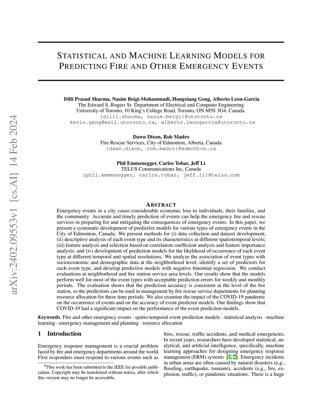 Emergency events in a city cause considerable economic loss to individuals, their families, and the community. Accurate and timely prediction of events can help the emergency fire and rescue services in preparing for and mitigating the consequences of emergency events. In this paper, we present a systematic development of predictive models for various types of emergency events in the City of Edmonton, Canada. We present methods for (i) data collection and dataset development; (ii) descriptive analysis of each event type and its characteristics at different spatiotemporal levels; (iii) feature analysis and selection based on correlation coefficient analysis and feature importance analysis; and (iv) development of prediction models for the likelihood of occurrence of each event type at different temporal and spatial resolutions. We analyze the association of event types with socioeconomic and demographic data at the neighborhood level, identify a set of predictors for each event type, and develop predictive models with negative binomial regression. We conduct evaluations at neighborhood and fire station service area levels. Our results show that the models perform well for most of the event types with acceptable prediction errors for weekly and monthly periods. The evaluation shows that the prediction accuracy is consistent at the level of the fire station, so the predictions can be used in management by fire rescue service departments for planning resource allocation for these time periods. We also examine the impact of the COVID-19 pandemic on the occurrence of events and on the accuracy of event predictor models. Our findings show that COVID-19 had a significant impact on the performance of the event prediction models.