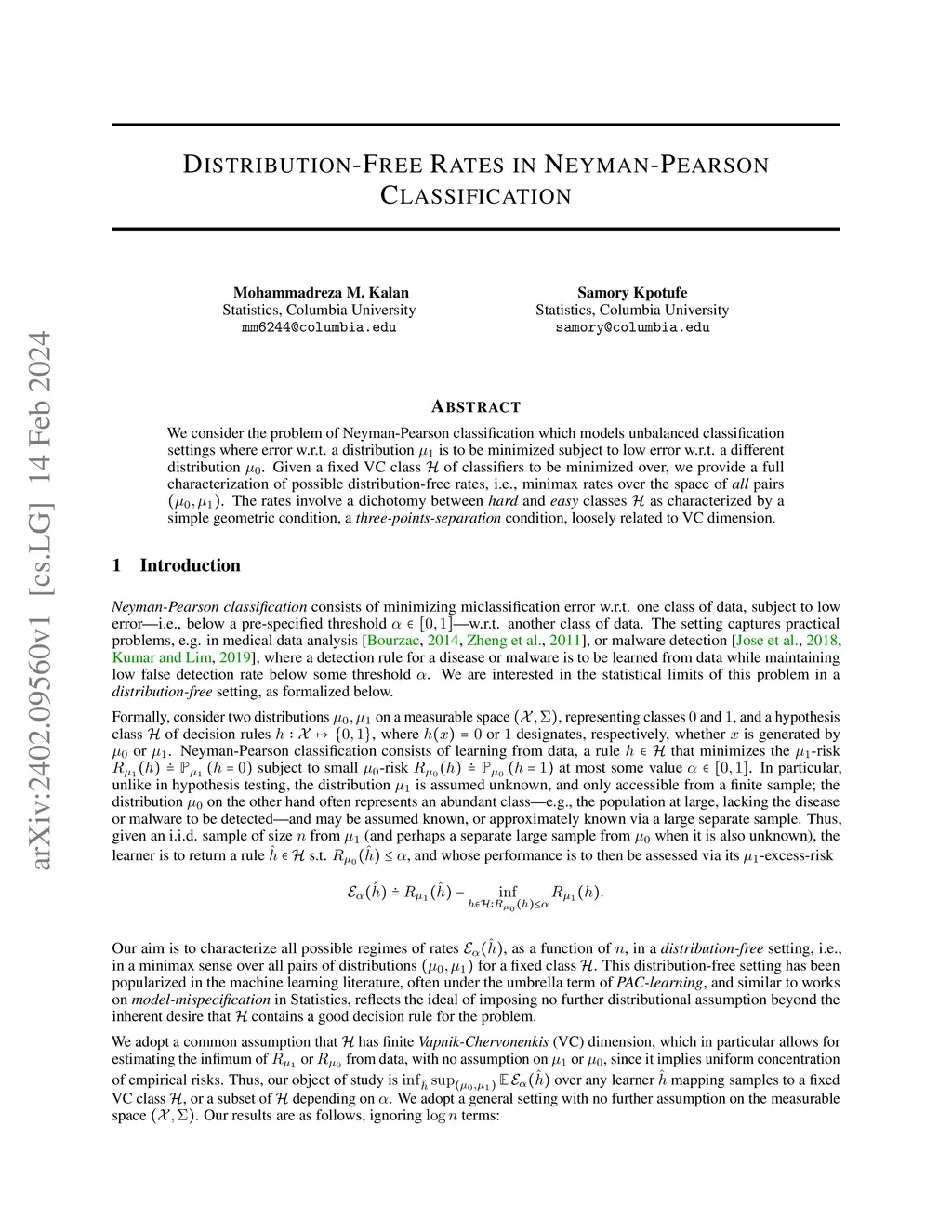 We consider the problem of Neyman-Pearson classification which models unbalanced classification settings where error w.r.t. a distribution is to be minimized subject to low error w.r.t. a different distribution . Given a fixed VC class of classifiers to be minimized over, we provide a full characterization of possible distribution-free rates, i.e., minimax rates over the space of all pairs . The rates involve a dichotomy between hard and easy classes as characterized by a simple geometric condition, a three-points-separation condition, loosely related to VC dimension.