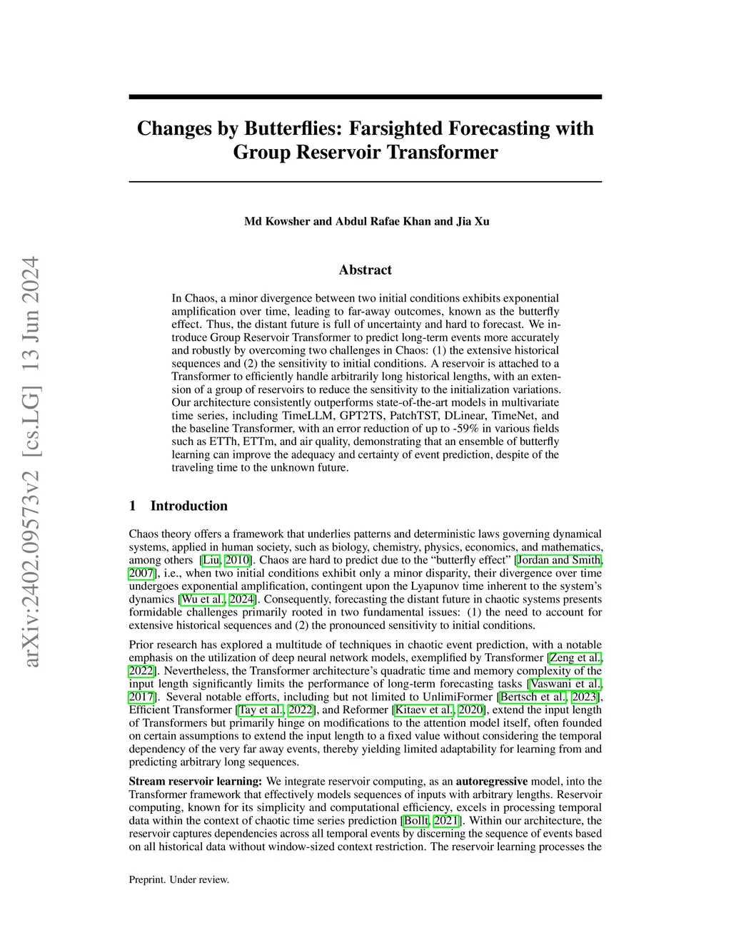 In Chaos, a minor divergence between two initial conditions exhibits exponential amplification over time, leading to far-away outcomes, known as the butterfly effect. Thus, the distant future is full of uncertainty and hard to forecast. We introduce Group Reservoir Transformer to predict long-term events more accurately and robustly by overcoming two challenges in Chaos: (1) the extensive historical sequences and (2) the sensitivity to initial conditions. A reservoir is attached to a Transformer to efficiently handle arbitrarily long historical lengths, with an extension of a group of reservoirs to reduce the sensitivity to the initialization variations. Our architecture consistently outperforms state-of-the-art models in multivariate time series, including TimeLLM, GPT2TS, PatchTST, DLinear, TimeNet, and the baseline Transformer, with an error reduction of up to -59\% in various fields such as ETTh, ETTm, and air quality, demonstrating that an ensemble of butterfly learning can improve the adequacy and certainty of event prediction, despite of the traveling time to the unknown future.