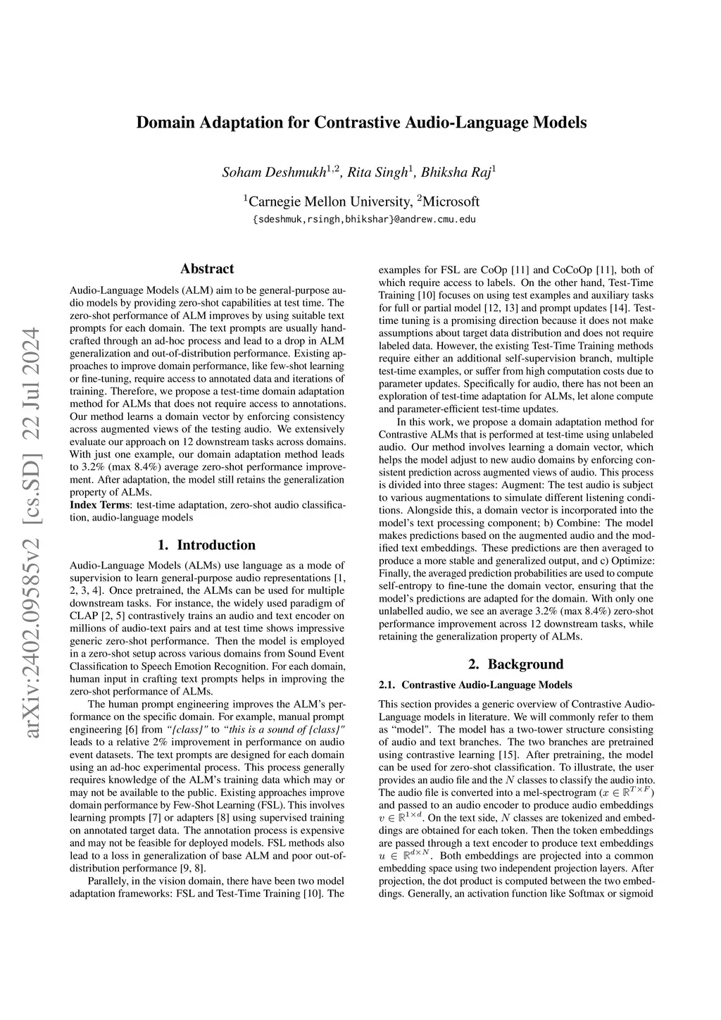Audio-Language Models (ALM) aim to be general-purpose audio models by providing zero-shot capabilities at test time. The zero-shot performance of ALM improves by using suitable text prompts for each domain. The text prompts are usually hand-crafted through an ad-hoc process and lead to a drop in ALM generalization and out-of-distribution performance. Existing approaches to improve domain performance, like few-shot learning or fine-tuning, require access to annotated data and iterations of training. Therefore, we propose a test-time domain adaptation method for ALMs that does not require access to annotations. Our method learns a domain vector by enforcing consistency across augmented views of the testing audio. We extensively evaluate our approach on 12 downstream tasks across domains. With just one example, our domain adaptation method leads to 3.2% (max 8.4%) average zero-shot performance improvement. After adaptation, the model still retains the generalization property of ALMs.