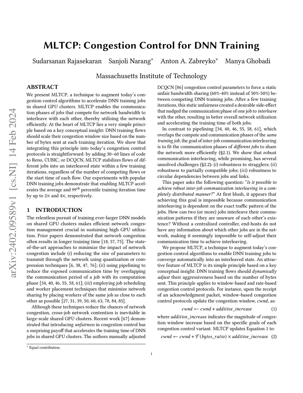 We present MLTCP, a technique to augment today's congestion control algorithms to accelerate DNN training jobs in shared GPU clusters. MLTCP enables the communication phases of jobs that compete for network bandwidth to interleave with each other, thereby utilizing the network efficiently. At the heart of MLTCP lies a very simple principle based on a key conceptual insight: DNN training flows should scale their congestion window size based on the number of bytes sent at each training iteration. We show that integrating this principle into today's congestion control protocols is straightforward: by adding 30-60 lines of code to Reno, CUBIC, or DCQCN, MLTCP stabilizes flows of different jobs into an interleaved state within a few training iterations, regardless of the number of competing flows or the start time of each flow. Our experiments with popular DNN training jobs demonstrate that enabling MLTCP accelerates the average and 99th percentile training iteration time by up to 2x and 4x, respectively.