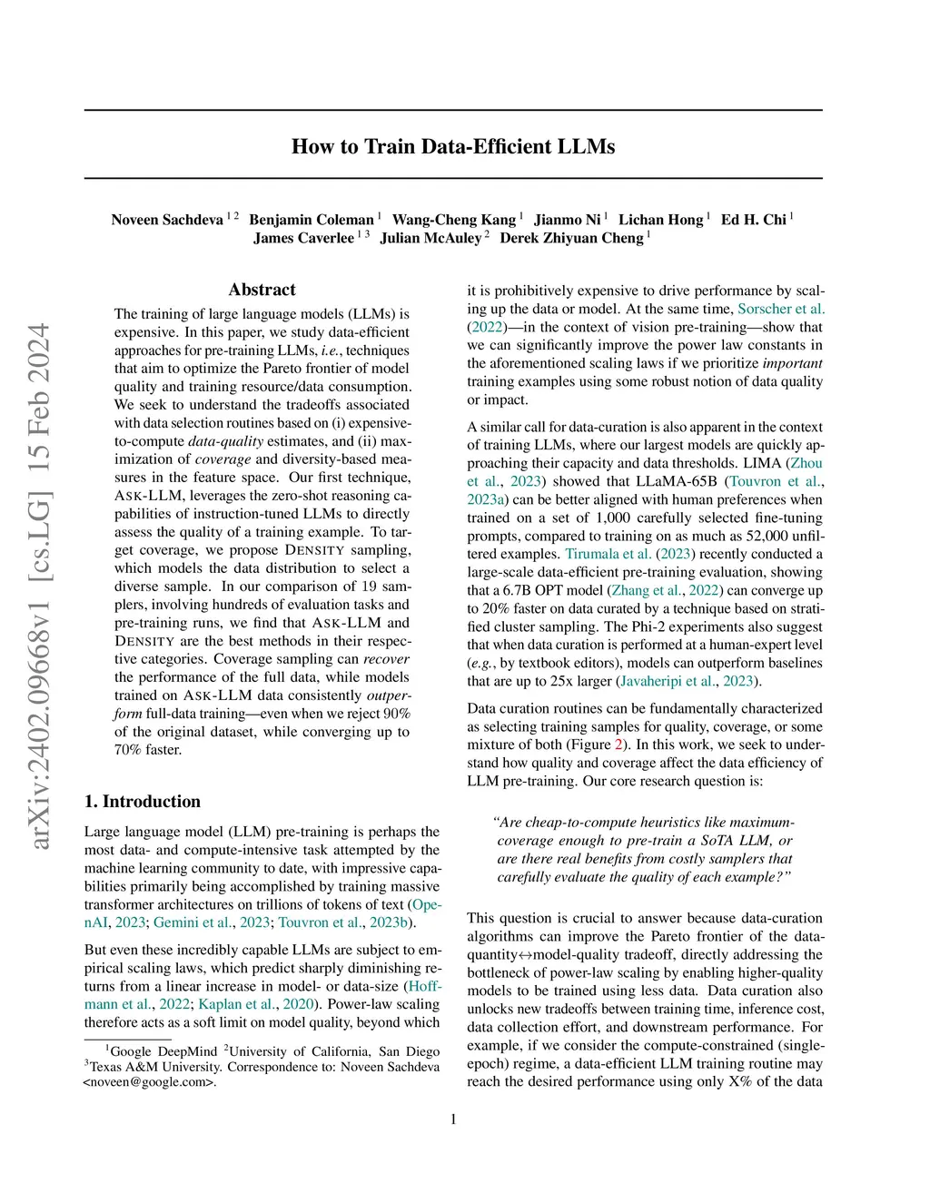 The training of large language models (LLMs) is expensive. In this paper, we study data-efficient approaches for pre-training LLMs, i.e., techniques that aim to optimize the Pareto frontier of model quality and training resource/data consumption. We seek to understand the tradeoffs associated with data selection routines based on (i) expensive-to-compute data-quality estimates, and (ii) maximization of coverage and diversity-based measures in the feature space. Our first technique, Ask-LLM, leverages the zero-shot reasoning capabilities of instruction-tuned LLMs to directly assess the quality of a training example. To target coverage, we propose Density sampling, which models the data distribution to select a diverse sample. In our comparison of 19 samplers, involving hundreds of evaluation tasks and pre-training runs, we find that Ask-LLM and Density are the best methods in their respective categories. Coverage sampling can recover the performance of the full data, while models trained on Ask-LLM data consistently outperform full-data training -- even when we reject 90% of the original dataset, while converging up to 70% faster.