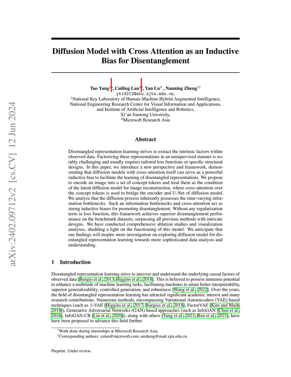Disentangled representation learning strives to extract the intrinsic factors within observed data. Factorizing these representations in an unsupervised manner is notably challenging and usually requires tailored loss functions or specific structural designs. In this paper, we introduce a new perspective and framework, demonstrating that diffusion models with cross-attention can serve as a powerful inductive bias to facilitate the learning of disentangled representations. We propose to encode an image to a set of concept tokens and treat them as the condition of the latent diffusion for image reconstruction, where cross-attention over the concept tokens is used to bridge the interaction between the encoder and diffusion. Without any additional regularization, this framework achieves superior disentanglement performance on the benchmark datasets, surpassing all previous methods with intricate designs. We have conducted comprehensive ablation studies and visualization analysis, shedding light on the functioning of this model. This is the first work to reveal the potent disentanglement capability of diffusion models with cross-attention, requiring no complex designs. We anticipate that our findings will inspire more investigation on exploring diffusion for disentangled representation learning towards more sophisticated data analysis and understanding.