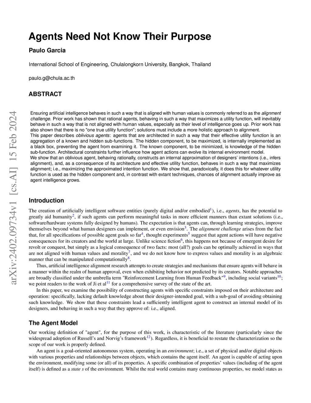 Ensuring artificial intelligence behaves in such a way that is aligned with human values is commonly referred to as the alignment challenge. Prior work has shown that rational agents, behaving in such a way that maximizes a utility function, will inevitably behave in such a way that is not aligned with human values, especially as their level of intelligence goes up. Prior work has also shown that there is no "one true utility function"; solutions must include a more holistic approach to alignment. This paper describes oblivious agents: agents that are architected in such a way that their effective utility function is an aggregation of a known and hidden sub-functions. The hidden component, to be maximized, is internally implemented as a black box, preventing the agent from examining it. The known component, to be minimized, is knowledge of the hidden sub-function. Architectural constraints further influence how agent actions can evolve its internal environment model. We show that an oblivious agent, behaving rationally, constructs an internal approximation of designers' intentions (i.e., infers alignment), and, as a consequence of its architecture and effective utility function, behaves in such a way that maximizes alignment; i.e., maximizing the approximated intention function. We show that, paradoxically, it does this for whatever utility function is used as the hidden component and, in contrast with extant techniques, chances of alignment actually improve as agent intelligence grows.