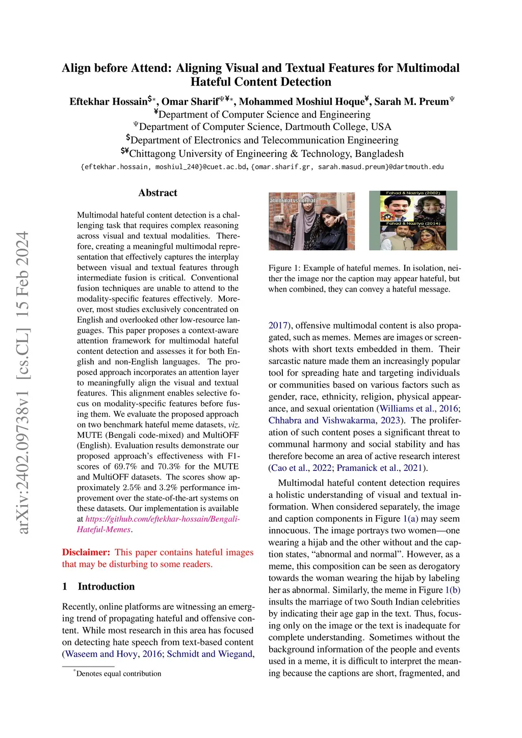 Multimodal hateful content detection is a challenging task that requires complex reasoning across visual and textual modalities. Therefore, creating a meaningful multimodal representation that effectively captures the interplay between visual and textual features through intermediate fusion is critical. Conventional fusion techniques are unable to attend to the modality-specific features effectively. Moreover, most studies exclusively concentrated on English and overlooked other low-resource languages. This paper proposes a context-aware attention framework for multimodal hateful content detection and assesses it for both English and non-English languages. The proposed approach incorporates an attention layer to meaningfully align the visual and textual features. This alignment enables selective focus on modality-specific features before fusing them. We evaluate the proposed approach on two benchmark hateful meme datasets, viz. MUTE (Bengali code-mixed) and MultiOFF (English). Evaluation results demonstrate our proposed approach's effectiveness with F1-scores of % and % for the MUTE and MultiOFF datasets. The scores show approximately % and % performance improvement over the state-of-the-art systems on these datasets. Our implementation is available at https://github.com/eftekhar-hossain/Bengali-Hateful-Memes.