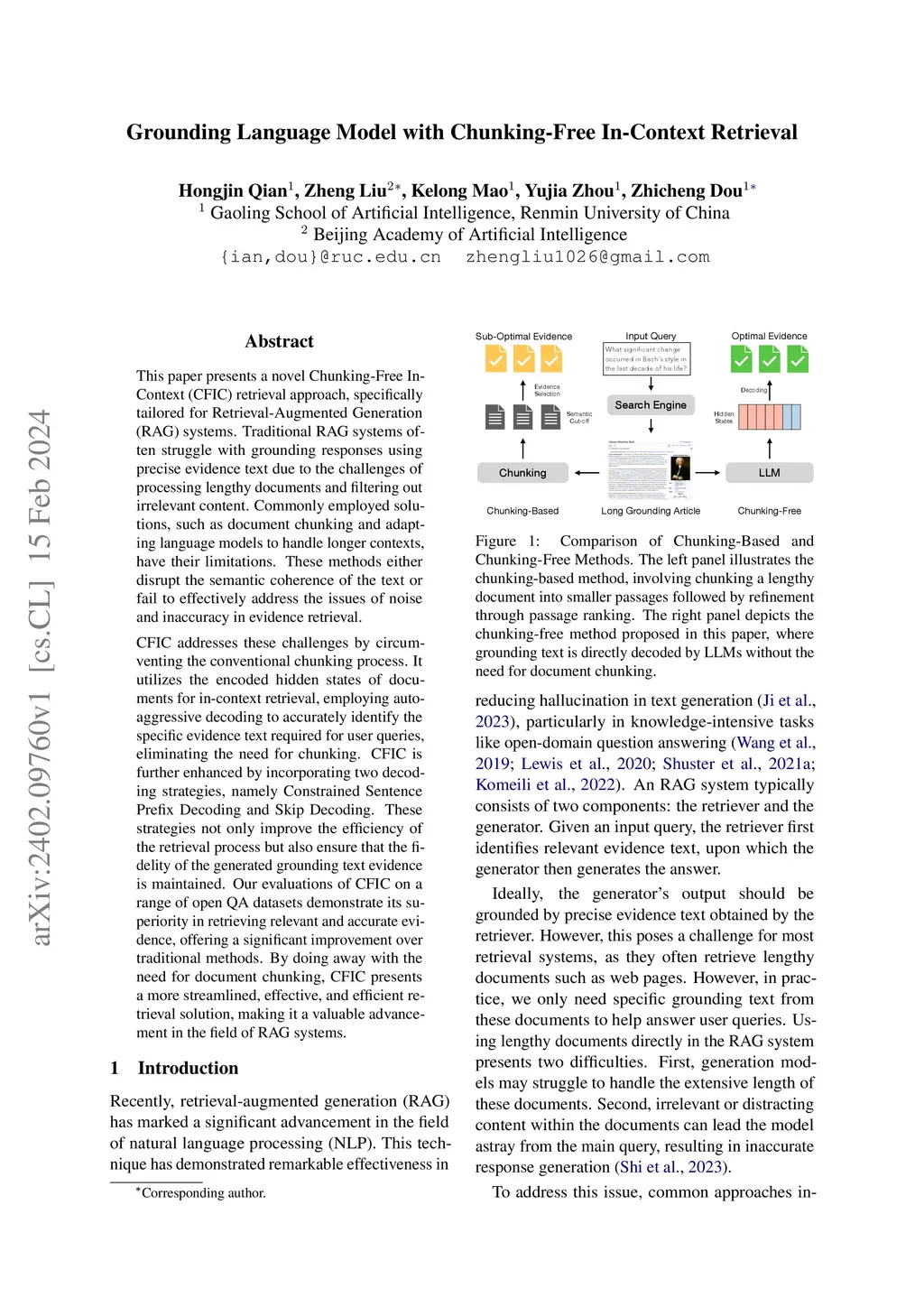 This paper presents a novel Chunking-Free In-Context (CFIC) retrieval approach, specifically tailored for Retrieval-Augmented Generation (RAG) systems. Traditional RAG systems often struggle with grounding responses using precise evidence text due to the challenges of processing lengthy documents and filtering out irrelevant content. Commonly employed solutions, such as document chunking and adapting language models to handle longer contexts, have their limitations. These methods either disrupt the semantic coherence of the text or fail to effectively address the issues of noise and inaccuracy in evidence retrieval. CFIC addresses these challenges by circumventing the conventional chunking process. It utilizes the encoded hidden states of documents for in-context retrieval, employing auto-aggressive decoding to accurately identify the specific evidence text required for user queries, eliminating the need for chunking. CFIC is further enhanced by incorporating two decoding strategies, namely Constrained Sentence Prefix Decoding and Skip Decoding. These strategies not only improve the efficiency of the retrieval process but also ensure that the fidelity of the generated grounding text evidence is maintained. Our evaluations of CFIC on a range of open QA datasets demonstrate its superiority in retrieving relevant and accurate evidence, offering a significant improvement over traditional methods. By doing away with the need for document chunking, CFIC presents a more streamlined, effective, and efficient retrieval solution, making it a valuable advancement in the field of RAG systems.