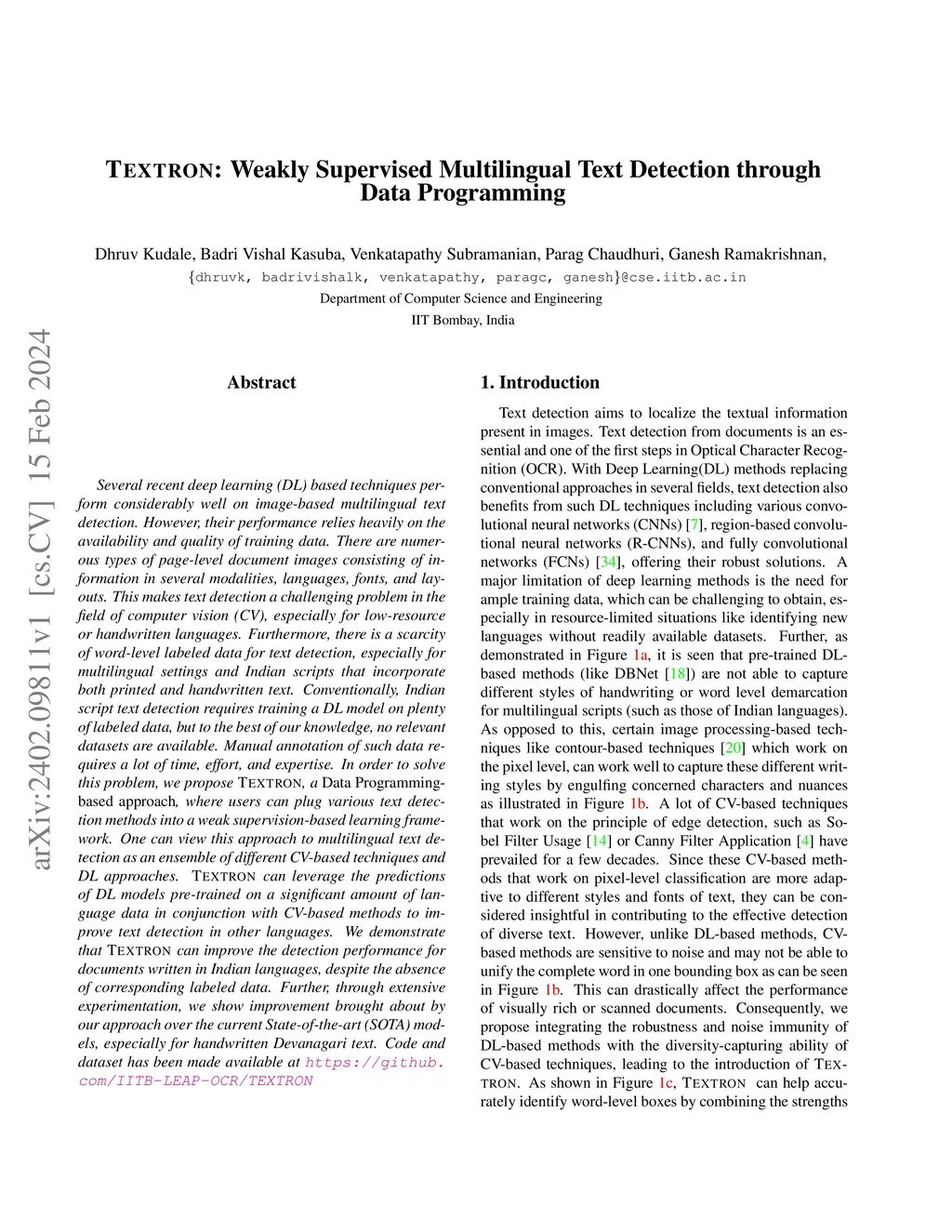 Several recent deep learning (DL) based techniques perform considerably well on image-based multilingual text detection. However, their performance relies heavily on the availability and quality of training data. There are numerous types of page-level document images consisting of information in several modalities, languages, fonts, and layouts. This makes text detection a challenging problem in the field of computer vision (CV), especially for low-resource or handwritten languages. Furthermore, there is a scarcity of word-level labeled data for text detection, especially for multilingual settings and Indian scripts that incorporate both printed and handwritten text. Conventionally, Indian script text detection requires training a DL model on plenty of labeled data, but to the best of our knowledge, no relevant datasets are available. Manual annotation of such data requires a lot of time, effort, and expertise. In order to solve this problem, we propose TEXTRON, a Data Programming-based approach, where users can plug various text detection methods into a weak supervision-based learning framework. One can view this approach to multilingual text detection as an ensemble of different CV-based techniques and DL approaches. TEXTRON can leverage the predictions of DL models pre-trained on a significant amount of language data in conjunction with CV-based methods to improve text detection in other languages. We demonstrate that TEXTRON can improve the detection performance for documents written in Indian languages, despite the absence of corresponding labeled data. Further, through extensive experimentation, we show improvement brought about by our approach over the current State-of-the-art (SOTA) models, especially for handwritten Devanagari text. Code and dataset has been made available at https://github.com/IITB-LEAP-OCR/TEXTRON