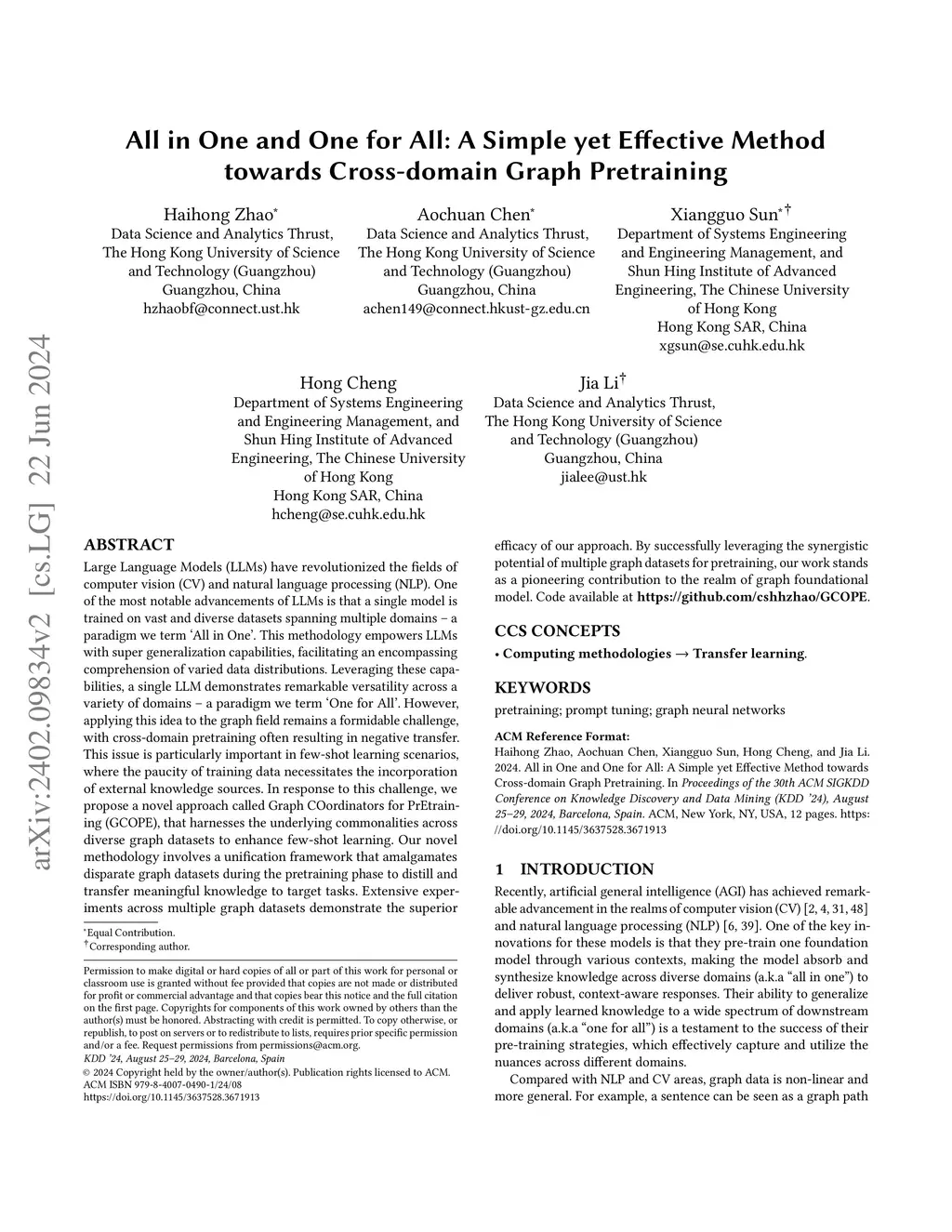 Large Language Models (LLMs) have revolutionized the fields of computer vision (CV) and natural language processing (NLP). One of the most notable advancements of LLMs is that a single model is trained on vast and diverse datasets spanning multiple domains -- a paradigm we term `All in One'. This methodology empowers LLMs with super generalization capabilities, facilitating an encompassing comprehension of varied data distributions. Leveraging these capabilities, a single LLM demonstrates remarkable versatility across a variety of domains -- a paradigm we term `One for All'. However, applying this idea to the graph field remains a formidable challenge, with cross-domain pretraining often resulting in negative transfer. This issue is particularly important in few-shot learning scenarios, where the paucity of training data necessitates the incorporation of external knowledge sources. In response to this challenge, we propose a novel approach called Graph COordinators for PrEtraining (GCOPE), that harnesses the underlying commonalities across diverse graph datasets to enhance few-shot learning. Our novel methodology involves a unification framework that amalgamates disparate graph datasets during the pretraining phase to distill and transfer meaningful knowledge to target tasks. Extensive experiments across multiple graph datasets demonstrate the superior efficacy of our approach. By successfully leveraging the synergistic potential of multiple graph datasets for pretraining, our work stands as a pioneering contribution to the realm of graph foundational model.