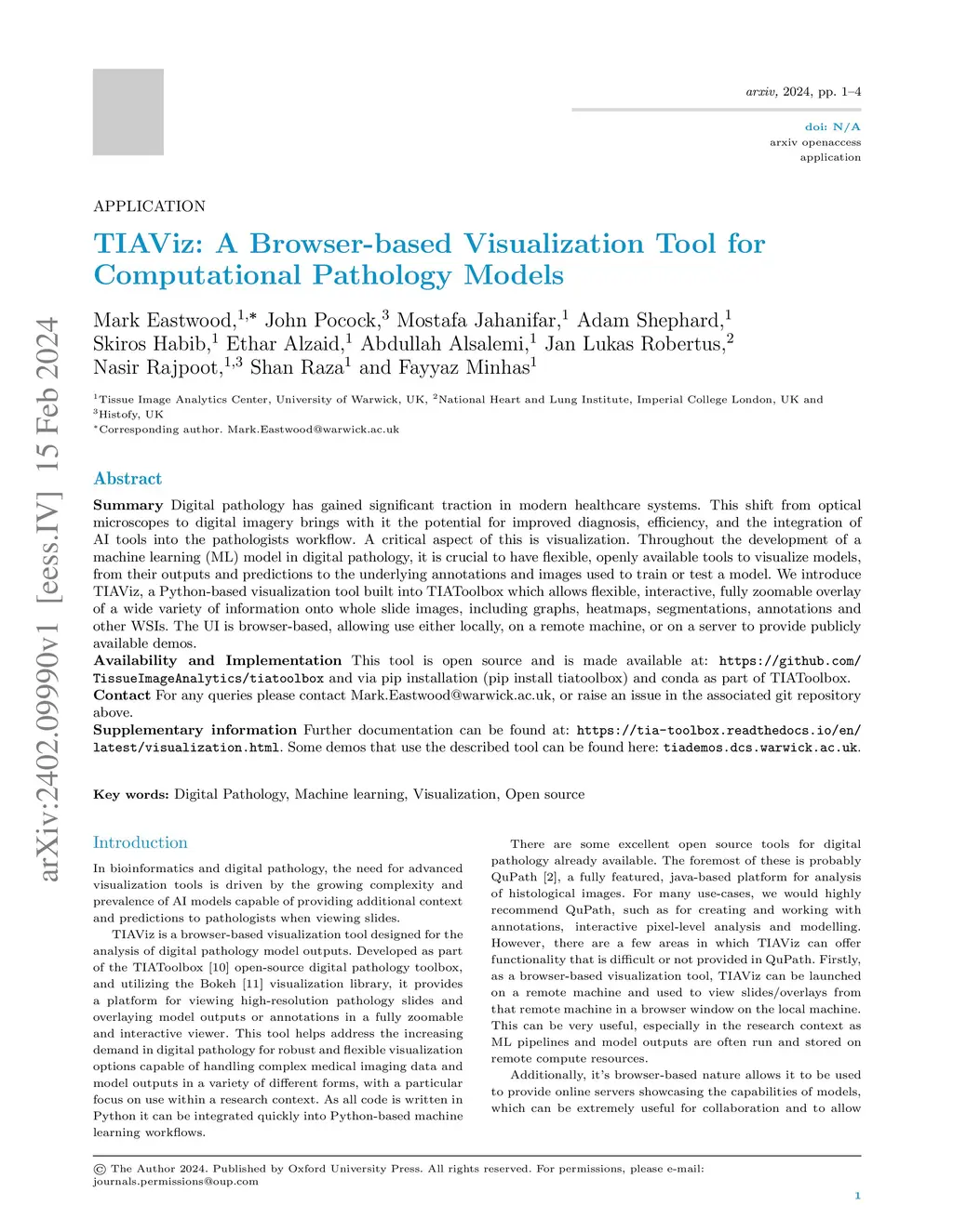 Digital pathology has gained significant traction in modern healthcare systems. This shift from optical microscopes to digital imagery brings with it the potential for improved diagnosis, efficiency, and the integration of AI tools into the pathologists workflow. A critical aspect of this is visualization. Throughout the development of a machine learning (ML) model in digital pathology, it is crucial to have flexible, openly available tools to visualize models, from their outputs and predictions to the underlying annotations and images used to train or test a model. We introduce TIAViz, a Python-based visualization tool built into TIAToolbox which allows flexible, interactive, fully zoomable overlay of a wide variety of information onto whole slide images, including graphs, heatmaps, segmentations, annotations and other WSIs. The UI is browser-based, allowing use either locally, on a remote machine, or on a server to provide publicly available demos. This tool is open source and is made available at: https://github.com/TissueImageAnalytics/tiatoolbox and via pip installation (pip install tiatoolbox) and conda as part of TIAToolbox.