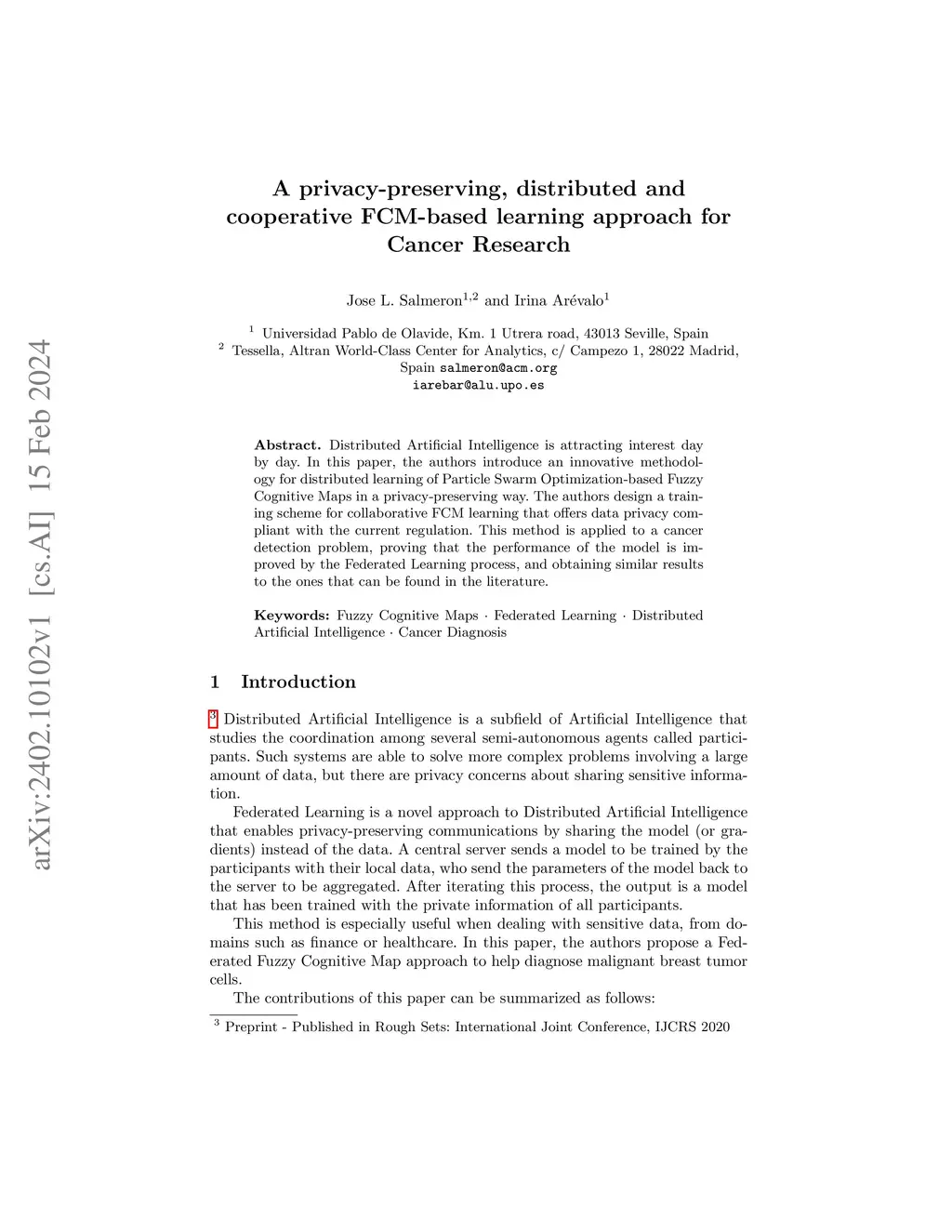Distributed Artificial Intelligence is attracting interest day by day. In this paper, the authors introduce an innovative methodology for distributed learning of Particle Swarm Optimization-based Fuzzy Cognitive Maps in a privacy-preserving way. The authors design a training scheme for collaborative FCM learning that offers data privacy compliant with the current regulation. This method is applied to a cancer detection problem, proving that the performance of the model is improved by the Federated Learning process, and obtaining similar results to the ones that can be found in the literature.