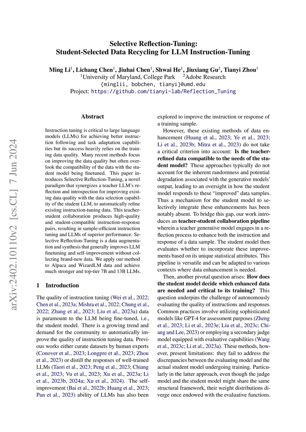 Instruction tuning is critical to large language models (LLMs) for achieving better instruction following and task adaptation capabilities but its success heavily relies on the training data quality. Many recent methods focus on improving the data quality but often overlook the compatibility of the data with the student model being finetuned. This paper introduces Selective Reflection-Tuning, a novel paradigm that synergizes a teacher LLM's reflection and introspection for improving existing data quality with the data selection capability of the student LLM, to automatically refine existing instruction-tuning data. This teacher-student collaboration produces high-quality and student-compatible instruction-response pairs, resulting in sample-efficient instruction tuning and LLMs of superior performance. Selective Reflection-Tuning is a data augmentation and synthesis that generally improves LLM finetuning and self-improvement without collecting brand-new data. We apply our method to Alpaca and WizardLM data and achieve much stronger and top-tier 7B and 13B LLMs.