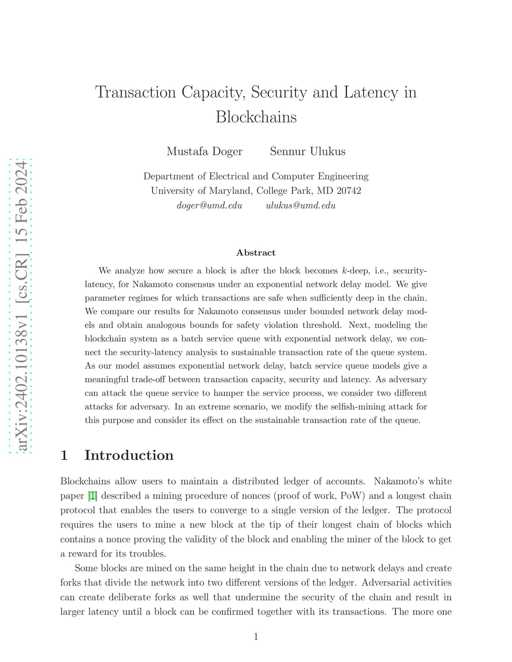 We analyze how secure a block is after the block becomes -deep, i.e., security-latency, for Nakamoto consensus under an exponential network delay model. We provide the fault tolerance and extensive bounds on safety violation probabilities given mining rate, delay rate and confirmation rules. Next, modeling the blockchain system as a batch service queue with exponential network delay, we connect the security-latency analysis to sustainable transaction rate of the queue system. As our model assumes exponential network delay, batch service queue models give a meaningful trade-off between transaction capacity, security and latency. Our results indicate that, by simply picking -block confirmation rule in Bitcoin instead of the convention of , mining rate, latency and throughput can be increased sixfold with the same safety guarantees. We further consider adversarial attacks on the queue service to hamper the service process. In an extreme scenario, we consider the selfish-mining attack for this purpose and provide the maximum adversarial block ratio in the longest chain under the exponential delay model. The ratio in turn reflects the maximum rate of decrease in the sustainable transaction rate of the queue.