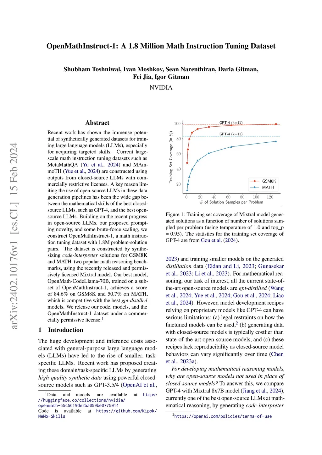 OpenMathInstruct-1: A 1.8 Million Math Instruction Tuning Dataset
