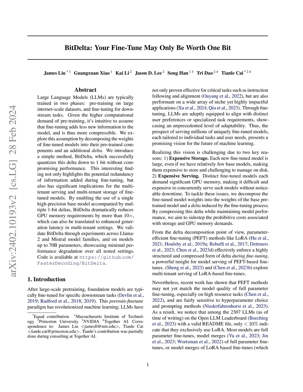 BitDelta: Your Fine-Tune May Only Be Worth One Bit