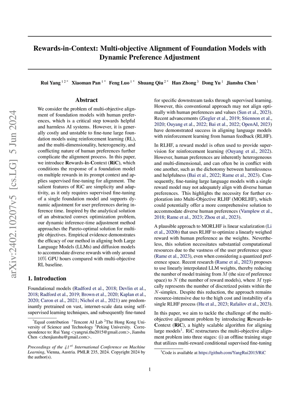 We consider the problem of multi-objective alignment of foundation models with human preferences, which is a critical step towards helpful and harmless AI systems. However, it is generally costly and unstable to fine-tune large foundation models using reinforcement learning (RL), and the multi-dimensionality, heterogeneity, and conflicting nature of human preferences further complicate the alignment process. In this paper, we introduce Rewards-in-Context (RiC), which conditions the response of a foundation model on multiple rewards in its prompt context and applies supervised fine-tuning for alignment. The salient features of RiC are simplicity and adaptivity, as it only requires supervised fine-tuning of a single foundation model and supports dynamic adjustment for user preferences during inference time. Inspired by the analytical solution of an abstracted convex optimization problem, our dynamic inference-time adjustment method approaches the Pareto-optimal solution for multiple objectives. Empirical evidence demonstrates the efficacy of our method in aligning both Large Language Models (LLMs) and diffusion models to accommodate diverse rewards with only around 10% GPU hours compared with multi-objective RL baseline.