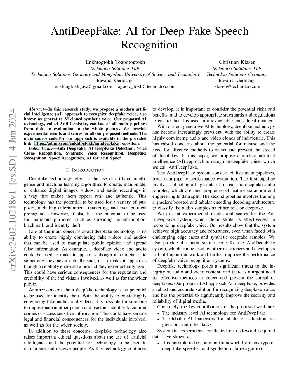 In this research study, we propose a modern artificial intelligence (AI) approach to recognize deepfake voice, also known as generative AI cloned synthetic voice. Our proposed AI technology, called AntiDeepFake, consists of all main pipelines from data to evaluation in the whole picture. We provide experimental results and scores for all our proposed methods. The main source code for our approach is available in the provided link: https://github.com/enkhtogtokh/antideepfake repository.