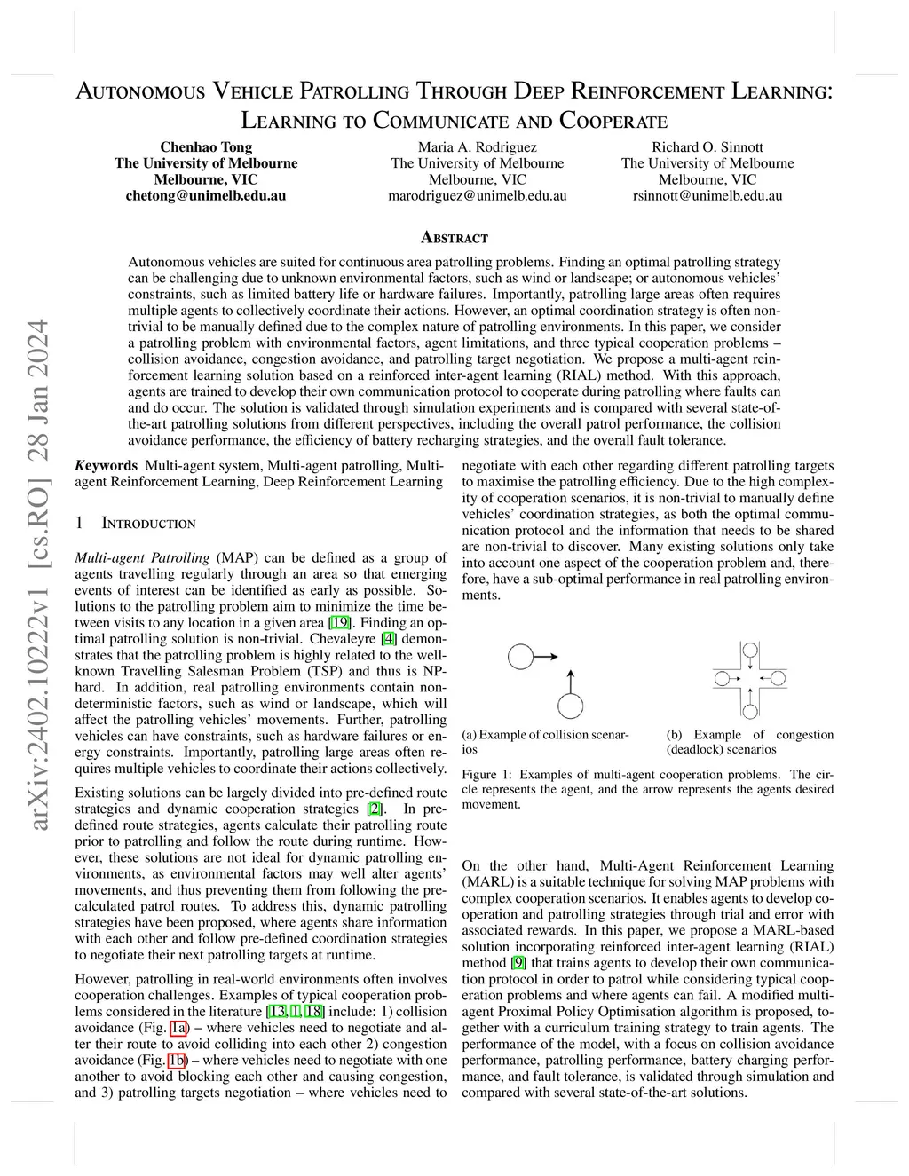 Autonomous vehicles are suited for continuous area patrolling problems. Finding an optimal patrolling strategy can be challenging due to unknown environmental factors, such as wind or landscape; or autonomous vehicles' constraints, such as limited battery life or hardware failures. Importantly, patrolling large areas often requires multiple agents to collectively coordinate their actions. However, an optimal coordination strategy is often non-trivial to be manually defined due to the complex nature of patrolling environments. In this paper, we consider a patrolling problem with environmental factors, agent limitations, and three typical cooperation problems -- collision avoidance, congestion avoidance, and patrolling target negotiation. We propose a multi-agent reinforcement learning solution based on a reinforced inter-agent learning (RIAL) method. With this approach, agents are trained to develop their own communication protocol to cooperate during patrolling where faults can and do occur. The solution is validated through simulation experiments and is compared with several state-of-the-art patrolling solutions from different perspectives, including the overall patrol performance, the collision avoidance performance, the efficiency of battery recharging strategies, and the overall fault tolerance.