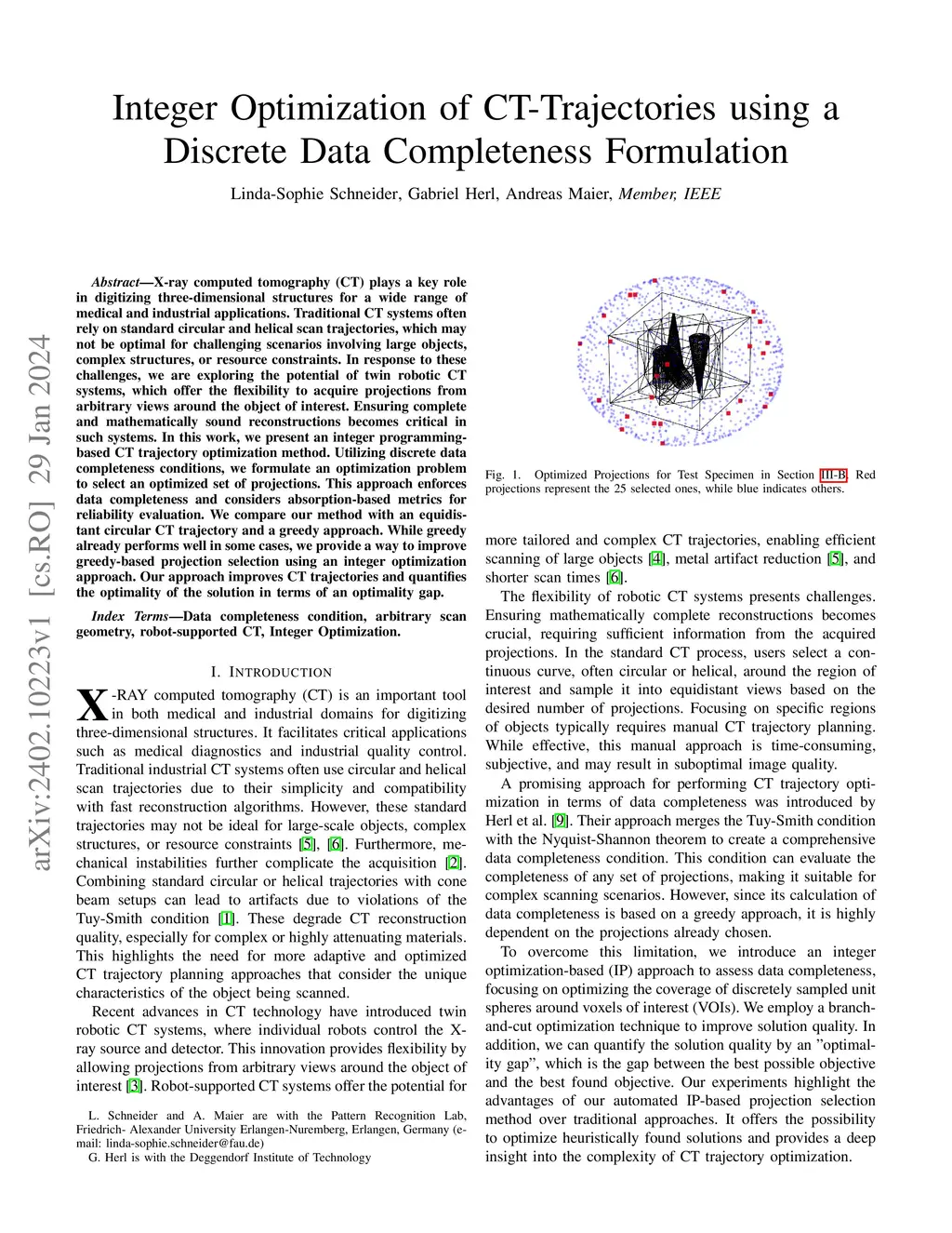 X-ray computed tomography (CT) plays a key role in digitizing three-dimensional structures for a wide range of medical and industrial applications. Traditional CT systems often rely on standard circular and helical scan trajectories, which may not be optimal for challenging scenarios involving large objects, complex structures, or resource constraints. In response to these challenges, we are exploring the potential of twin robotic CT systems, which offer the flexibility to acquire projections from arbitrary views around the object of interest. Ensuring complete and mathematically sound reconstructions becomes critical in such systems. In this work, we present an integer programming-based CT trajectory optimization method. Utilizing discrete data completeness conditions, we formulate an optimization problem to select an optimized set of projections. This approach enforces data completeness and considers absorption-based metrics for reliability evaluation. We compare our method with an equidistant circular CT trajectory and a greedy approach. While greedy already performs well in some cases, we provide a way to improve greedy-based projection selection using an integer optimization approach. Our approach improves CT trajectories and quantifies the optimality of the solution in terms of an optimality gap.