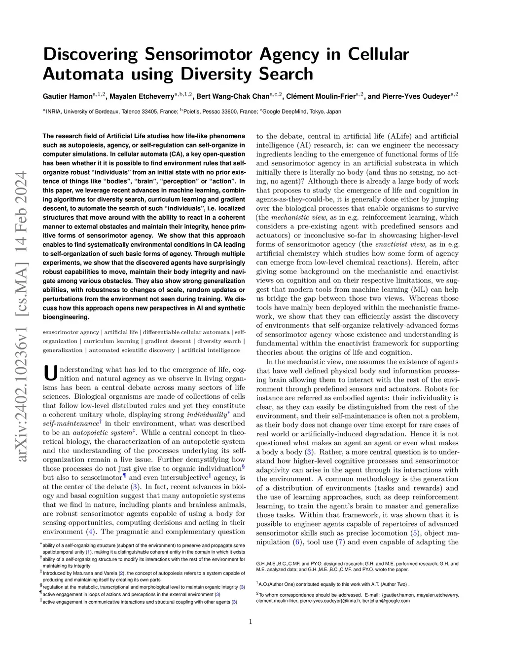 The research field of Artificial Life studies how life-like phenomena such as autopoiesis, agency, or self-regulation can self-organize in computer simulations. In cellular automata (CA), a key open-question has been whether it it is possible to find environment rules that self-organize robust "individuals" from an initial state with no prior existence of things like "bodies", "brain", "perception" or "action". In this paper, we leverage recent advances in machine learning, combining algorithms for diversity search, curriculum learning and gradient descent, to automate the search of such "individuals", i.e. localized structures that move around with the ability to react in a coherent manner to external obstacles and maintain their integrity, hence primitive forms of sensorimotor agency. We show that this approach enables to find systematically environmental conditions in CA leading to self-organization of such basic forms of agency. Through multiple experiments, we show that the discovered agents have surprisingly robust capabilities to move, maintain their body integrity and navigate among various obstacles. They also show strong generalization abilities, with robustness to changes of scale, random updates or perturbations from the environment not seen during training. We discuss how this approach opens new perspectives in AI and synthetic bioengineering.