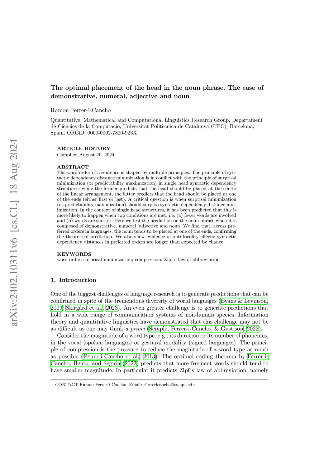 The optimal placement of the head in the noun phrase. The case of
