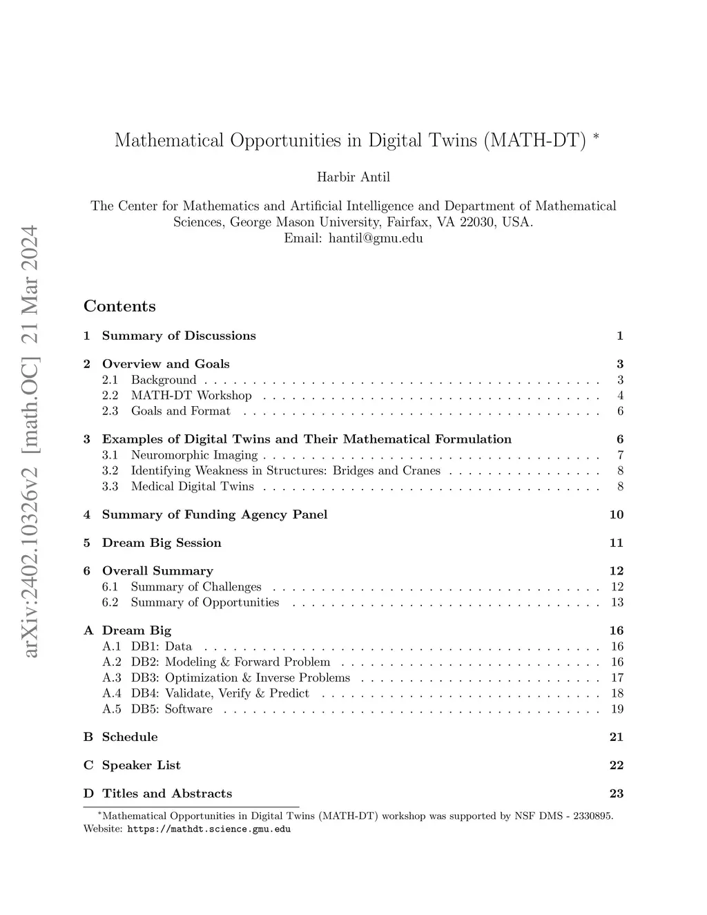 The report describes the discussions from the Workshop on Mathematical Opportunities in Digital Twins (MATH-DT) from December 11-13, 2023, George Mason University. It illustrates that foundational Mathematical advances are required for Digital Twins (DTs) that are different from traditional approaches. A traditional model, in biology, physics, engineering or medicine, starts with a generic physical law (e.g., equations) and is often a simplification of reality. A DT starts with a specific ecosystem, object or person (e.g., personalized care) representing reality, requiring multi -scale, -physics modeling and coupling. Thus, these processes begin at opposite ends of the simulation and modeling pipeline, requiring different reliability criteria and uncertainty assessments. Additionally, unlike existing approaches, a DT assists humans to make decisions for the physical system, which (via sensors) in turn feeds data into the DT, and operates for the life of the physical system. While some of the foundational mathematical research can be done without a specific application context, one must also keep specific applications in mind for DTs. E.g., modeling a bridge or a biological system (a patient), or a socio-technical system (a city) is very different. The models range from differential equations (deterministic/uncertain) in engineering, to stochastic in biology, including agent-based. These are multi-scale hybrid models or large scale (multi-objective) optimization problems under uncertainty. There are no universal models or approaches. For e.g., Kalman filters for forecasting might work in engineering, but can fail in biomedical domain. Ad hoc studies, with limited systematic work, have shown that AI/ML methods can fail for simple engineering systems and can work well for biomedical problems. A list of `Mathematical Opportunities and Challenges' concludes the report.