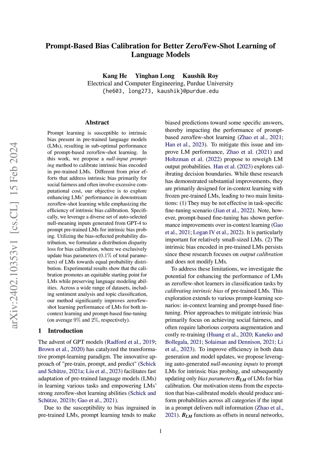 Prompt learning is susceptible to intrinsic bias present in pre-trained language models (LMs), resulting in sub-optimal performance of prompt-based zero/few-shot learning. In this work, we propose a null-input prompting method to calibrate intrinsic bias encoded in pre-trained LMs. Different from prior efforts that address intrinsic bias primarily for social fairness and often involve excessive computational cost, our objective is to explore enhancing LMs' performance in downstream zero/few-shot learning while emphasizing the efficiency of intrinsic bias calibration. Specifically, we leverage a diverse set of auto-selected null-meaning inputs generated from GPT-4 to prompt pre-trained LMs for intrinsic bias probing. Utilizing the bias-reflected probability distribution, we formulate a distribution disparity loss for bias calibration, where we exclusively update bias parameters ( of total parameters) of LMs towards equal probability distribution. Experimental results show that the calibration promotes an equitable starting point for LMs while preserving language modeling abilities. Across a wide range of datasets, including sentiment analysis and topic classification, our method significantly improves zero/few-shot learning performance of LMs for both in-context learning and prompt-based fine-tuning (on average and , respectively).