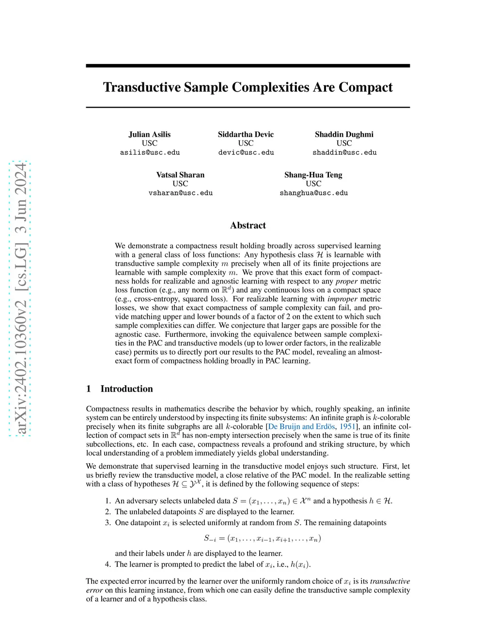 We demonstrate a compactness result holding broadly across supervised learning with a general class of loss functions: Any hypothesis class is learnable with transductive sample complexity precisely when all of its finite projections are learnable with sample complexity . We prove that this exact form of compactness holds for realizable and agnostic learning with respect to any proper metric loss function (e.g., any norm on ) and any continuous loss on a compact space (e.g., cross-entropy, squared loss). For realizable learning with improper metric losses, we show that exact compactness of sample complexity can fail, and provide matching upper and lower bounds of a factor of 2 on the extent to which such sample complexities can differ. We conjecture that larger gaps are possible for the agnostic case. Furthermore, invoking the equivalence between sample complexities in the PAC and transductive models (up to lower order factors, in the realizable case) permits us to directly port our results to the PAC model, revealing an almost-exact form of compactness holding broadly in PAC learning.