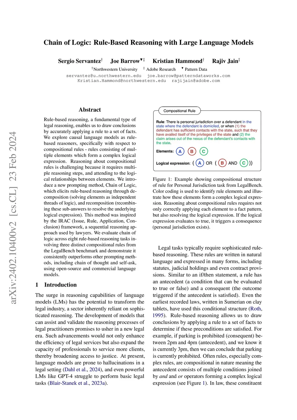Rule-based reasoning, a fundamental type of legal reasoning, enables us to draw conclusions by accurately applying a rule to a set of facts. We explore causal language models as rule-based reasoners, specifically with respect to compositional rules - rules consisting of multiple elements which form a complex logical expression. Reasoning about compositional rules is challenging because it requires multiple reasoning steps, and attending to the logical relationships between elements. We introduce a new prompting method, Chain of Logic, which elicits rule-based reasoning through decomposition (solving elements as independent threads of logic), and recomposition (recombining these sub-answers to resolve the underlying logical expression). This method was inspired by the IRAC (Issue, Rule, Application, Conclusion) framework, a sequential reasoning approach used by lawyers. We evaluate chain of logic across eight rule-based reasoning tasks involving three distinct compositional rules from the LegalBench benchmark and demonstrate it consistently outperforms other prompting methods, including chain of thought and self-ask, using open-source and commercial language models.