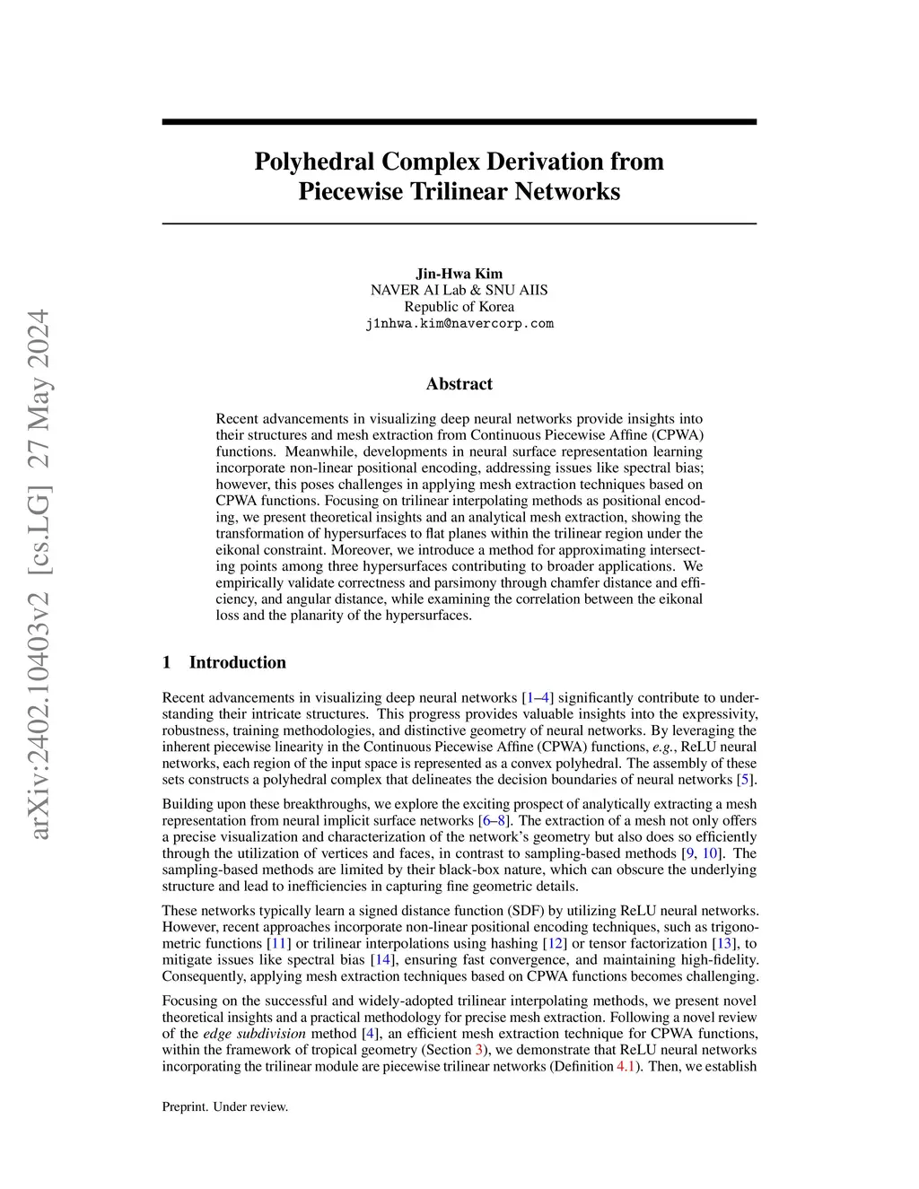 Recent advancements in visualizing deep neural networks provide insights into their structures and mesh extraction from Continuous Piecewise Affine (CPWA) functions. Meanwhile, developments in neural surface representation learning incorporate non-linear positional encoding, addressing issues like spectral bias; however, this poses challenges in applying mesh extraction techniques based on CPWA functions. Focusing on trilinear interpolating methods as positional encoding, we present theoretical insights and an analytical mesh extraction, showing the transformation of hypersurfaces to flat planes within the trilinear region under the eikonal constraint. Moreover, we introduce a method for approximating intersecting points among three hypersurfaces contributing to broader applications. We empirically validate correctness and parsimony through chamfer distance and efficiency, and angular distance, while examining the correlation between the eikonal loss and the planarity of the hypersurfaces.