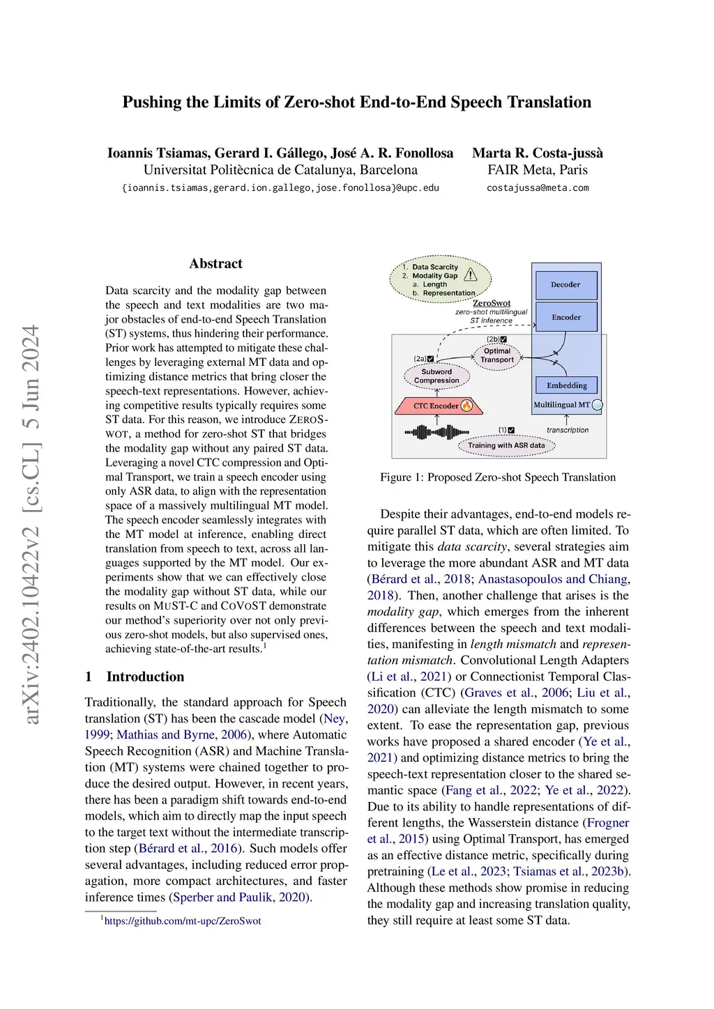 Data scarcity and the modality gap between the speech and text modalities are two major obstacles of end-to-end Speech Translation (ST) systems, thus hindering their performance. Prior work has attempted to mitigate these challenges by leveraging external MT data and optimizing distance metrics that bring closer the speech-text representations. However, achieving competitive results typically requires some ST data. For this reason, we introduce ZeroSwot, a method for zero-shot ST that bridges the modality gap without any paired ST data. Leveraging a novel CTC compression and Optimal Transport, we train a speech encoder using only ASR data, to align with the representation space of a massively multilingual MT model. The speech encoder seamlessly integrates with the MT model at inference, enabling direct translation from speech to text, across all languages supported by the MT model. Our experiments show that we can effectively close the modality gap without ST data, while our results on MuST-C and CoVoST demonstrate our method's superiority over not only previous zero-shot models, but also supervised ones, achieving state-of-the-art results.