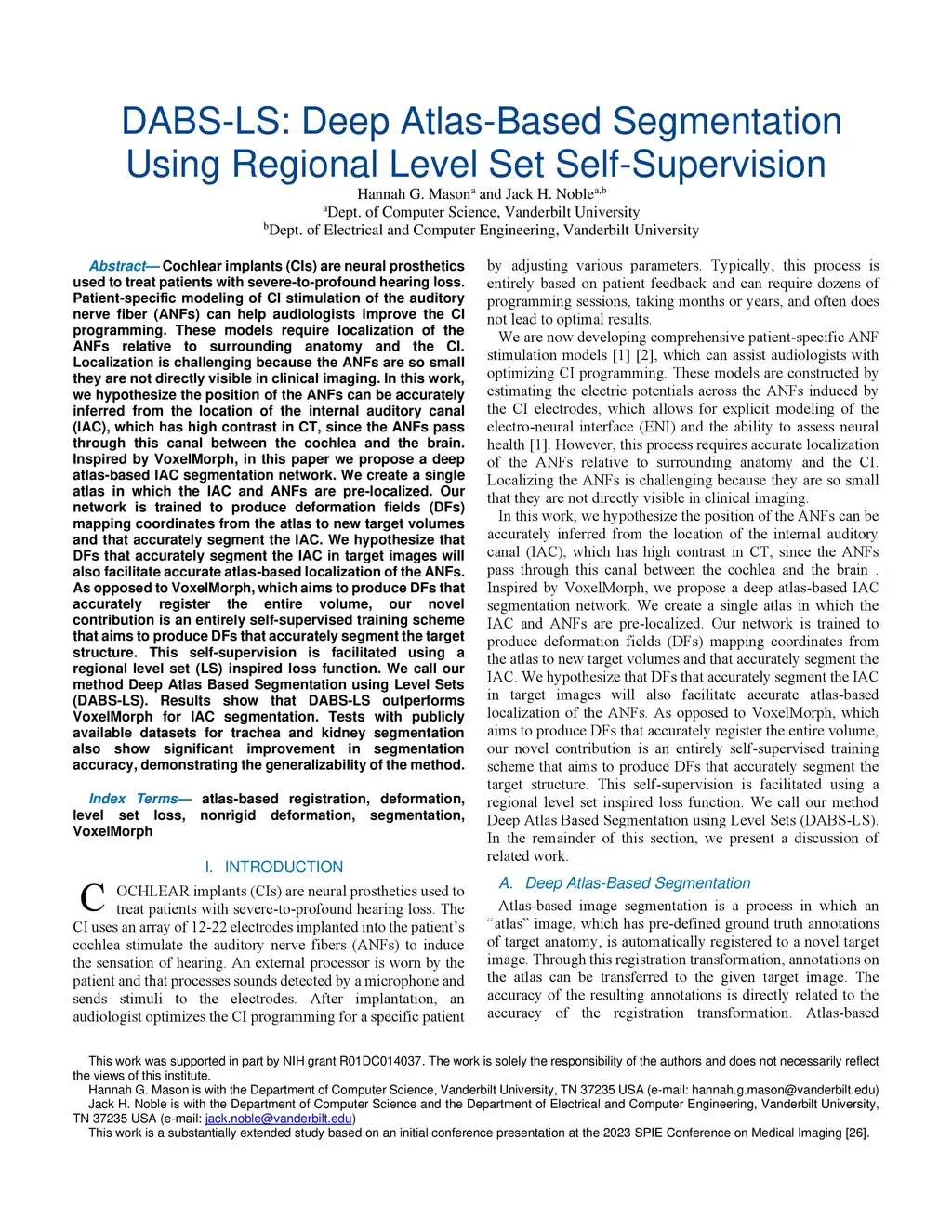 Cochlear implants (CIs) are neural prosthetics used to treat patients with severe-to-profound hearing loss. Patient-specific modeling of CI stimulation of the auditory nerve fiber (ANFs) can help audiologists improve the CI programming. These models require localization of the ANFs relative to surrounding anatomy and the CI. Localization is challenging because the ANFs are so small they are not directly visible in clinical imaging. In this work, we hypothesize the position of the ANFs can be accurately inferred from the location of the internal auditory canal (IAC), which has high contrast in CT, since the ANFs pass through this canal between the cochlea and the brain. Inspired by VoxelMorph, in this paper we propose a deep atlas-based IAC segmentation network. We create a single atlas in which the IAC and ANFs are pre-localized. Our network is trained to produce deformation fields (DFs) mapping coordinates from the atlas to new target volumes and that accurately segment the IAC. We hypothesize that DFs that accurately segment the IAC in target images will also facilitate accurate atlas-based localization of the ANFs. As opposed to VoxelMorph, which aims to produce DFs that accurately register the entire volume, our novel contribution is an entirely self-supervised training scheme that aims to produce DFs that accurately segment the target structure. This self-supervision is facilitated using a regional level set (LS) inspired loss function. We call our method Deep Atlas Based Segmentation using Level Sets (DABS-LS). Results show that DABS-LS outperforms VoxelMorph for IAC segmentation. Tests with publicly available datasets for trachea and kidney segmentation also show significant improvement in segmentation accuracy, demonstrating the generalizability of the method.
