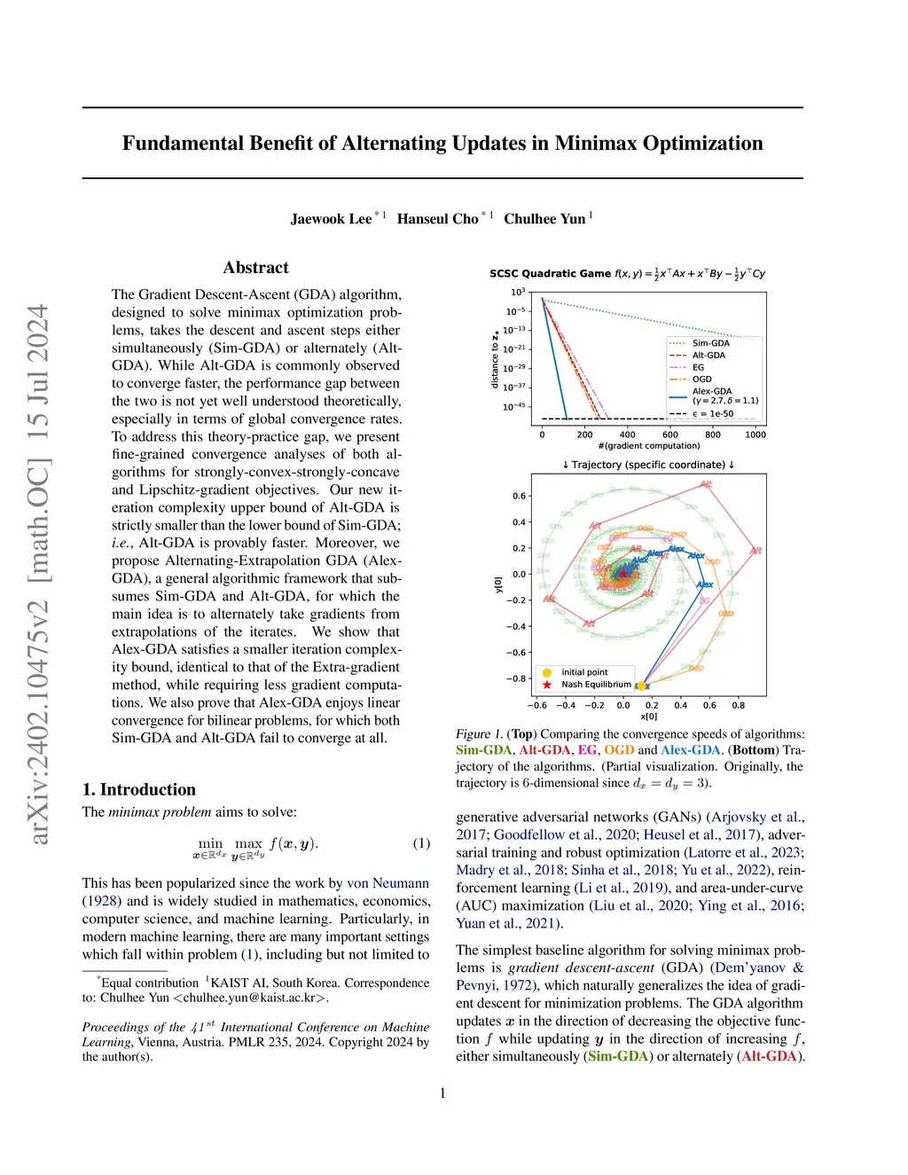 The Gradient Descent-Ascent (GDA) algorithm, designed to solve minimax optimization problems, takes the descent and ascent steps either simultaneously (Sim-GDA) or alternately (Alt-GDA). While Alt-GDA is commonly observed to converge faster, the performance gap between the two is not yet well understood theoretically, especially in terms of global convergence rates. To address this theory-practice gap, we present fine-grained convergence analyses of both algorithms for strongly-convex-strongly-concave and Lipschitz-gradient objectives. Our new iteration complexity upper bound of Alt-GDA is strictly smaller than the lower bound of Sim-GDA; i.e., Alt-GDA is provably faster. Moreover, we propose Alternating-Extrapolation GDA (Alex-GDA), a general algorithmic framework that subsumes Sim-GDA and Alt-GDA, for which the main idea is to alternately take gradients from extrapolations of the iterates. We show that Alex-GDA satisfies a smaller iteration complexity bound, identical to that of the Extra-gradient method, while requiring less gradient computations. We also prove that Alex-GDA enjoys linear convergence for bilinear problems, for which both Sim-GDA and Alt-GDA fail to converge at all.