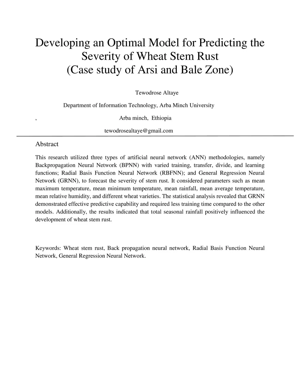 This research utilized three types of artificial neural network (ANN) methodologies, namely Backpropagation Neural Network (BPNN) with varied training, transfer, divide, and learning functions; Radial Basis Function Neural Network (RBFNN); and General Regression Neural Network (GRNN), to forecast the severity of stem rust. It considered parameters such as mean maximum temperature, mean minimum temperature, mean rainfall, mean average temperature, mean relative humidity, and different wheat varieties. The statistical analysis revealed that GRNN demonstrated effective predictive capability and required less training time compared to the other models. Additionally, the results indicated that total seasonal rainfall positively influenced the development of wheat stem rust. Keywords: Wheat stem rust, Back propagation neural network, Radial Basis Function Neural Network, General Regression Neural Network.