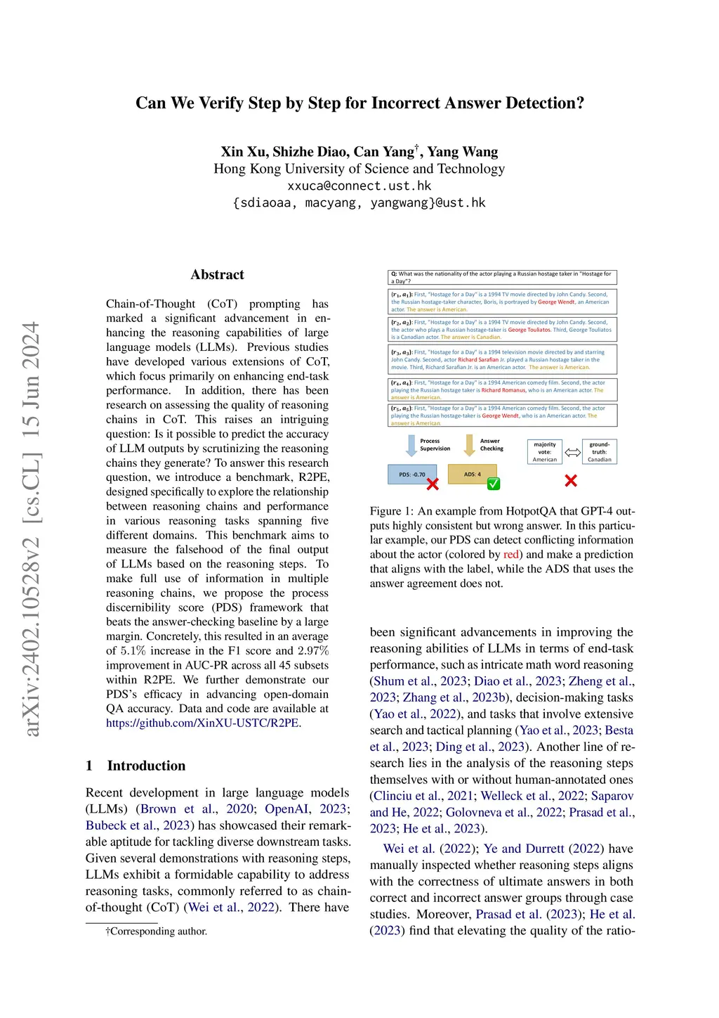 Chain-of-Thought (CoT) prompting has marked a significant advancement in enhancing the reasoning capabilities of large language models (LLMs). Previous studies have developed various extensions of CoT, which focus primarily on enhancing end-task performance. In addition, there has been research on assessing the quality of reasoning chains in CoT. This raises an intriguing question: Is it possible to predict the accuracy of LLM outputs by scrutinizing the reasoning chains they generate? To answer this research question, we introduce a benchmark, R2PE, designed specifically to explore the relationship between reasoning chains and performance in various reasoning tasks spanning five different domains. This benchmark aims to measure the falsehood of the final output of LLMs based on the reasoning steps. To make full use of information in multiple reasoning chains, we propose the process discernibility score (PDS) framework that beats the answer-checking baseline by a large margin. Concretely, this resulted in an average of increase in the F1 score and improvement in AUC-PR across all 45 subsets within R2PE. We further demonstrate our PDS's efficacy in advancing open-domain QA accuracy.