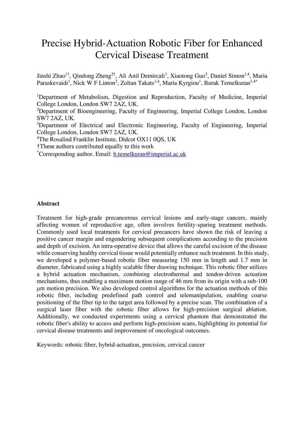 Precise Hybrid-Actuation Robotic Fiber for Enhanced Cervical Disease