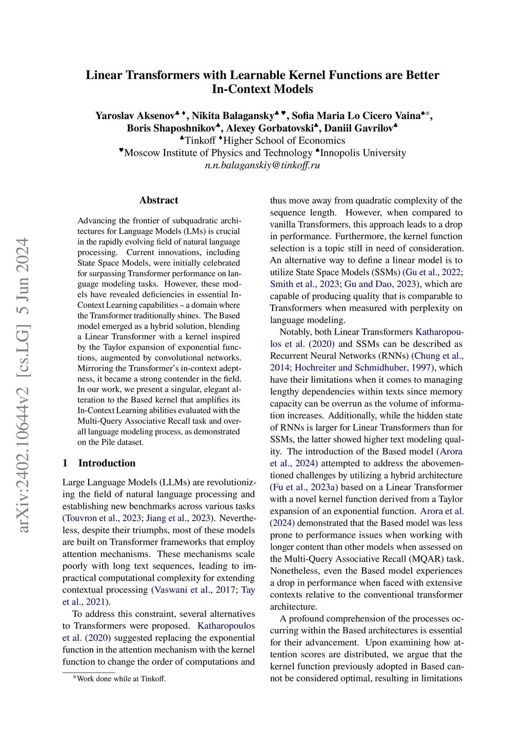 Advancing the frontier of subquadratic architectures for Language Models (LMs) is crucial in the rapidly evolving field of natural language processing. Current innovations, including State Space Models, were initially celebrated for surpassing Transformer performance on language modeling tasks. However, these models have revealed deficiencies in essential In-Context Learning capabilities - a domain where the Transformer traditionally shines. The Based model emerged as a hybrid solution, blending a Linear Transformer with a kernel inspired by the Taylor expansion of exponential functions, augmented by convolutional networks. Mirroring the Transformer's in-context adeptness, it became a strong contender in the field. In our work, we present a singular, elegant alteration to the Based kernel that amplifies its In-Context Learning abilities evaluated with the Multi-Query Associative Recall task and overall language modeling process, as demonstrated on the Pile dataset.