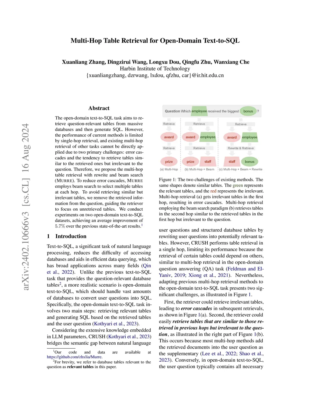 Open-domain text-to-SQL is an important task that retrieves question-relevant tables from massive databases and then generates SQL. However, existing retrieval methods that retrieve in a single hop do not pay attention to the text-to-SQL challenge of schema linking, which is aligning the entities in the question with table entities, reflected in two aspects: similar irrelevant entity and domain mismatch entity. Therefore, we propose our method, the multi-hop table retrieval with rewrite and beam search (Murre). To reduce the effect of the similar irrelevant entity, our method focuses on unretrieved entities at each hop and considers the low-ranked tables by beam search. To alleviate the limitation of domain mismatch entity, Murre rewrites the question based on retrieved tables in multiple hops, decreasing the domain gap with relevant tables. We conduct experiments on SpiderUnion and BirdUnion+, reaching new state-of-the-art results with an average improvement of 6.38%.