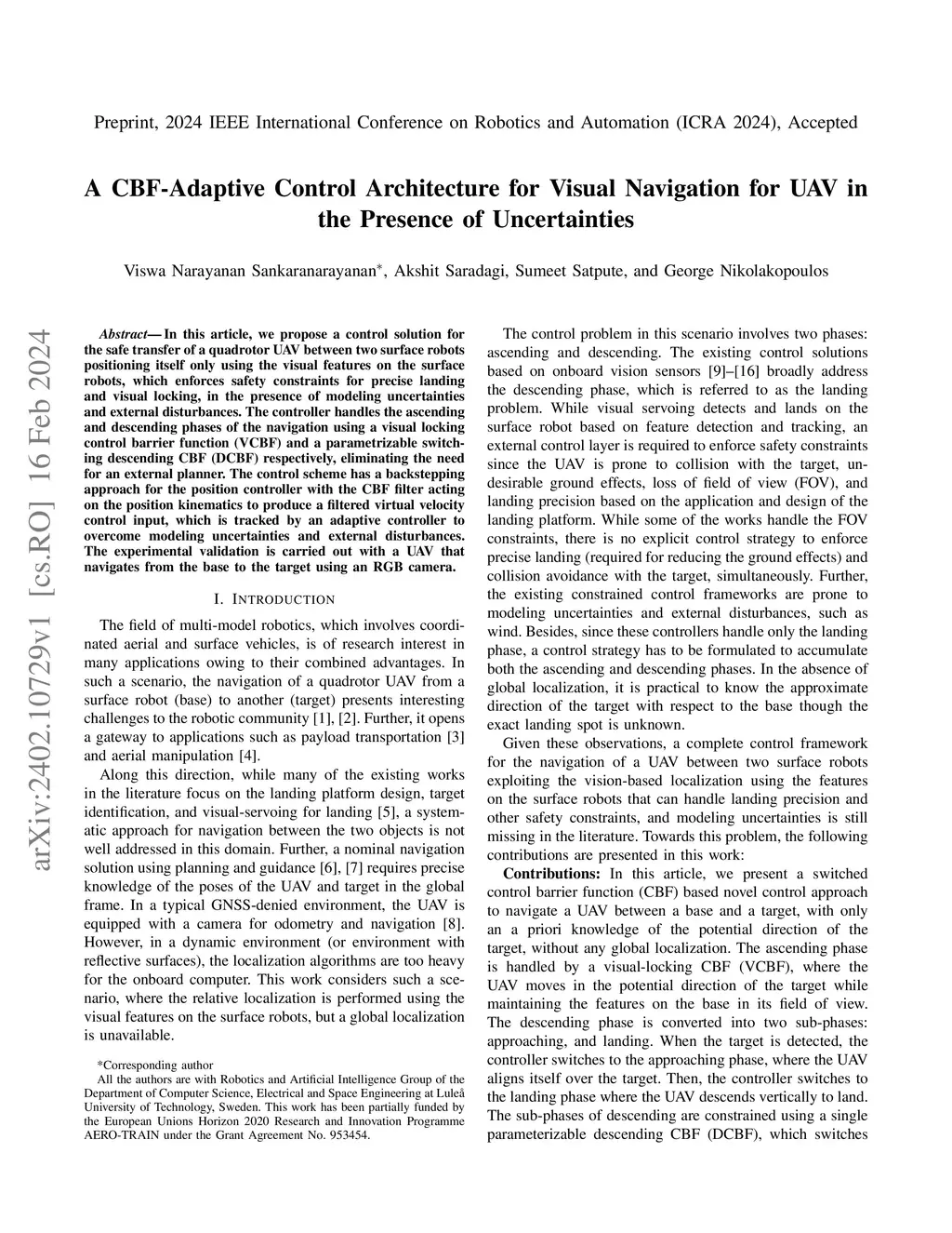 In this article, we propose a control solution for the safe transfer of a quadrotor UAV between two surface robots positioning itself only using the visual features on the surface robots, which enforces safety constraints for precise landing and visual locking, in the presence of modeling uncertainties and external disturbances. The controller handles the ascending and descending phases of the navigation using a visual locking control barrier function (VCBF) and a parametrizable switching descending CBF (DCBF) respectively, eliminating the need for an external planner. The control scheme has a backstepping approach for the position controller with the CBF filter acting on the position kinematics to produce a filtered virtual velocity control input, which is tracked by an adaptive controller to overcome modeling uncertainties and external disturbances. The experimental validation is carried out with a UAV that navigates from the base to the target using an RGB camera.