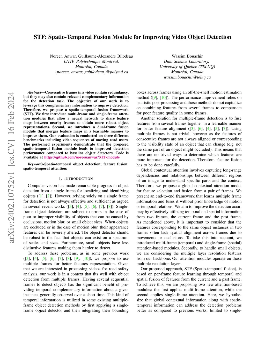 Consecutive frames in a video contain redundancy, but they may also contain relevant complementary information for the detection task. The objective of our work is to leverage this complementary information to improve detection. Therefore, we propose a spatio-temporal fusion framework (STF). We first introduce multi-frame and single-frame attention modules that allow a neural network to share feature maps between nearby frames to obtain more robust object representations. Second, we introduce a dual-frame fusion module that merges feature maps in a learnable manner to improve them. Our evaluation is conducted on three different benchmarks including video sequences of moving road users. The performed experiments demonstrate that the proposed spatio-temporal fusion module leads to improved detection performance compared to baseline object detectors. Code is available at https://github.com/noreenanwar/STF-module