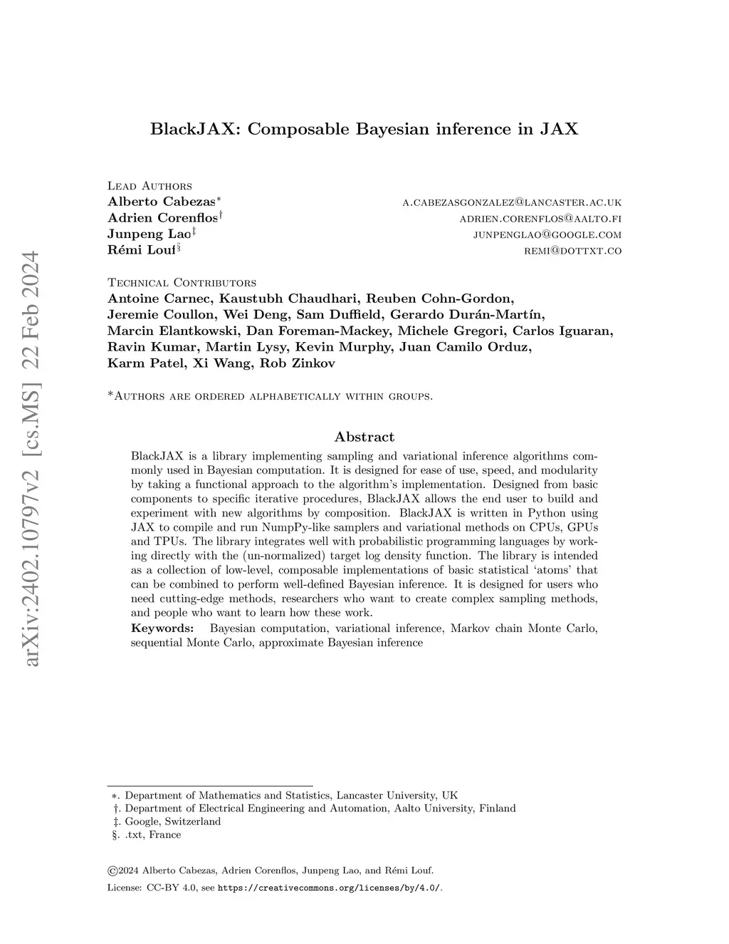 BlackJAX is a library implementing sampling and variational inference algorithms commonly used in Bayesian computation. It is designed for ease of use, speed, and modularity by taking a functional approach to the algorithms' implementation. BlackJAX is written in Python, using JAX to compile and run NumpPy-like samplers and variational methods on CPUs, GPUs, and TPUs. The library integrates well with probabilistic programming languages by working directly with the (un-normalized) target log density function. BlackJAX is intended as a collection of low-level, composable implementations of basic statistical 'atoms' that can be combined to perform well-defined Bayesian inference, but also provides high-level routines for ease of use. It is designed for users who need cutting-edge methods, researchers who want to create complex sampling methods, and people who want to learn how these work.